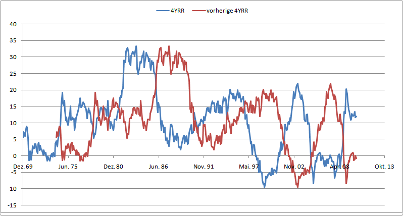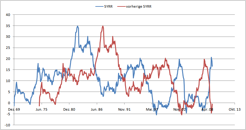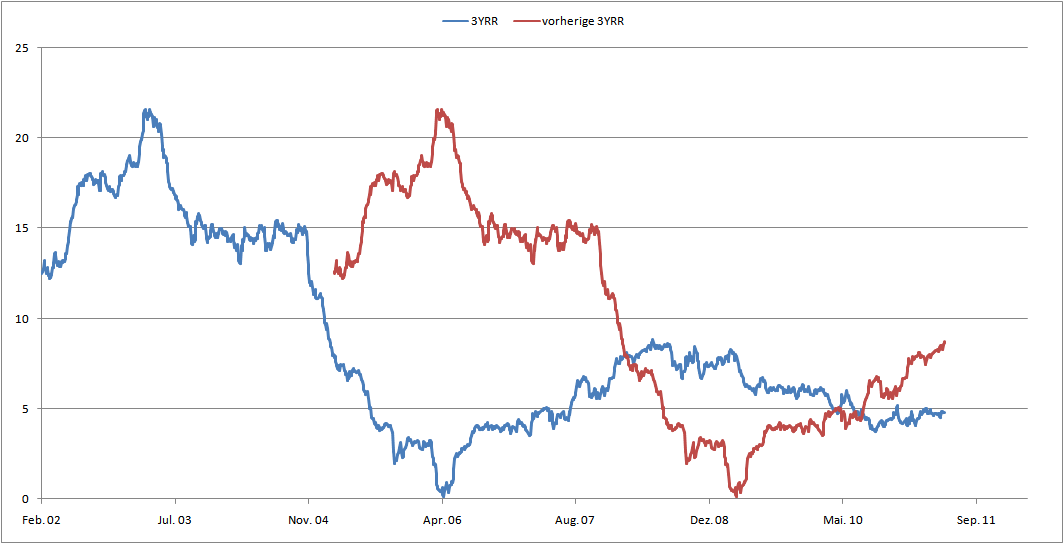 Der gewählte Zeitraum (2002-2011) genauso wie der rollierende Abschnitt (3 Jahre) haben sicher enormen Einfluss auf das ermittelte Ergebnis. Wenn Du einen anderen Zeitraum betrachtest wird etwas anderes dabei rauskommen, je nachdem wie die Abfolge von Hausse und Baisse gelaufen ist. Und auch ob Du mit 3jähriger oder 5jähriger rollierenden Rendite rechnest müsste unterschiedliche Ergebnisse liefern. Auffällig ist, dass insbesondere nach Zeiten besonders hoher Renditen, sehr magere Jahre folgen. Dies könnte aber ein zufälliges Ergebnis durch den gewählten Zeitraum/rollierenden Abschnitt sein und bei anderen Rahmenbedingungen nicht zutreffen.