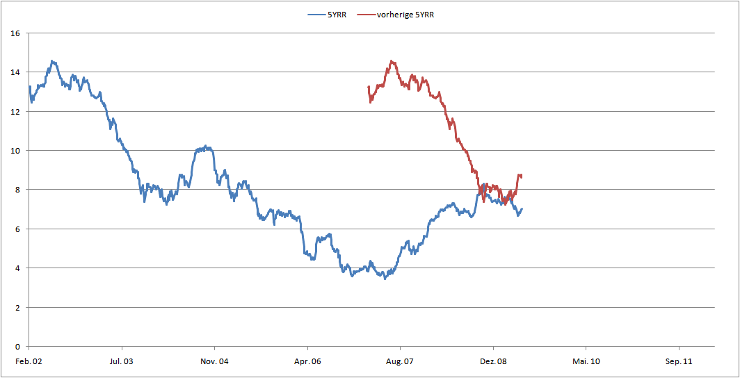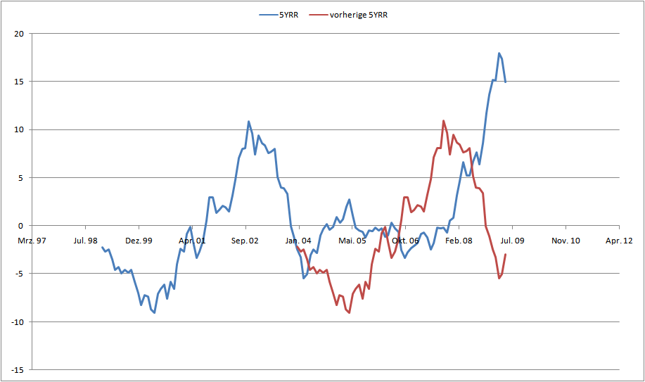 2. Da der Ethna erst 2002 aufgelegt wurde, gibt es nur recht wenige Daten von "vorherige 5-Jahresrendite" (rote Kurve). Nämlich nur von Februar 2007 bis Mai 2009, also gerade einmal etwas mehr als 2 Jahre. Nicht sonderlich aussagekräftig.