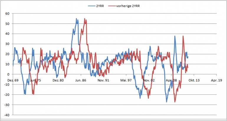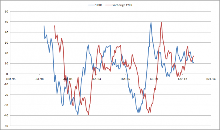 Ein Blick auf die zeitliche Darstellung der roll. Renditen zeigt einem hingegen, ob es Zeiträume gab, indem die Verknüpfung zwischen vergangenen und künftiger Rendite stärker oder schwächer war. Das geht natürlich zulasten der genauen Darstellung der Verknüpfungen, was eben die Punktwolke dann wieder liefert.