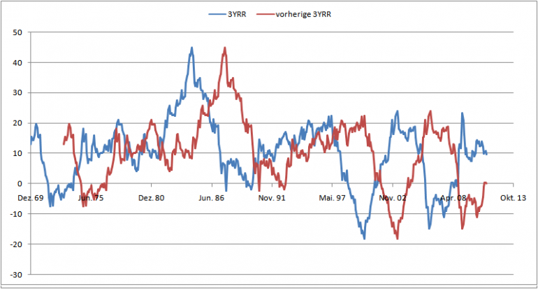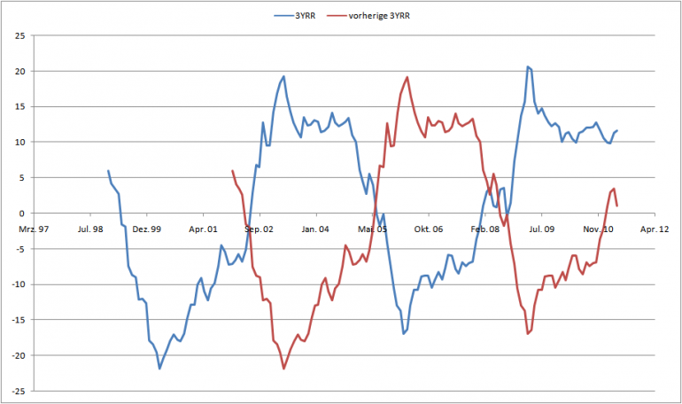 Diesmal: Annualisierte rollierende 3-Jahresrenditen im Vergleich zur vorhergehenden 3-Jahresrendite.