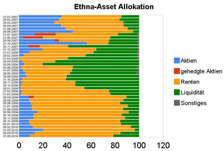 Die Entscheidung zwischen Carmignac Patrimoine und Ethna-Aktiv E solltest du auch von deiner eigenen Markteinschätzung abhängig machen. Es ist ja bekannt, dass der Ethna-Fonds meist etwas weniger Aktien als der Patrimoine enthält. Im letzten Jahr war das ganz besonders ausgeprägt. Wenn du also von weiter stark steigenden Aktienmärkten ausgehst, würde ich eher zum Patrimoine raten. Oder zu einem Fonds, der noch mehr Aktien halten darf (C-Quadrat ARTS Total Return Global AMI, ETF-Dachfonds P). Wenn du dagegen eine Seitwärtsbewegung oder einen erneuten Einbruch erwartest, könnte der Ethna-Fonds die bessere Wahl sein. Dessen Managment ist nämlich auch eher pessimistisch.