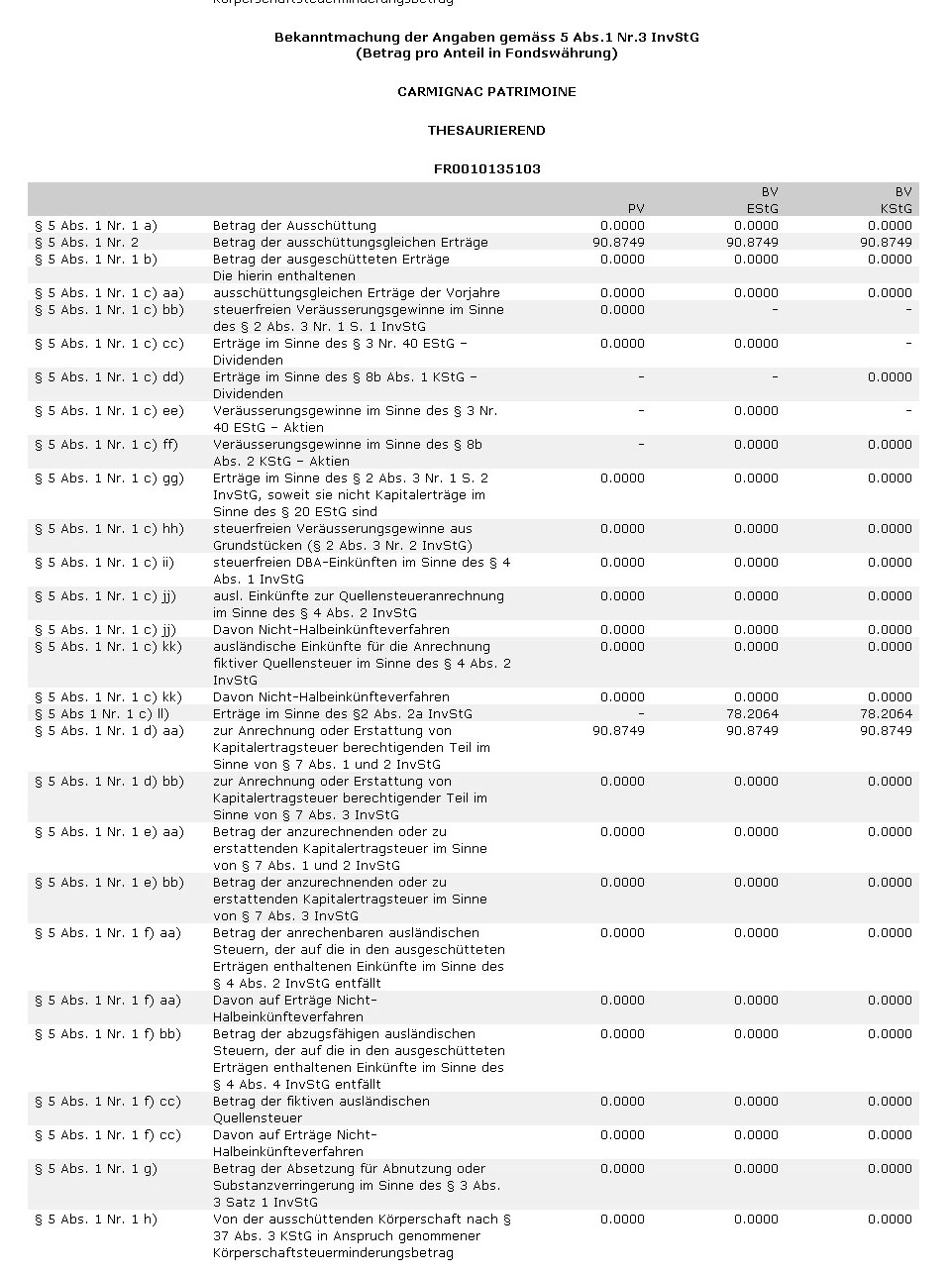 II) heute eingelogt, und es ist eine sogenannte Ertragsabrechnung für den Patri drin. Laut diesem Dokument beträgt die Ertragsthesaurierung 90,87 € pro Anteil. Weiterhin heißt es in diesem Dokument: "Dieser Ertrag ist dem Ertragsjahr 2008 zuzuordnen. Bitte legen Sie diesen Beleg Ihrer Steuererklärung 2008 bei.