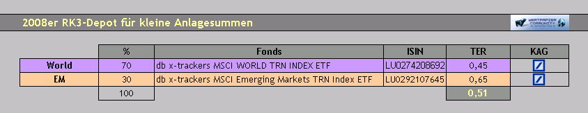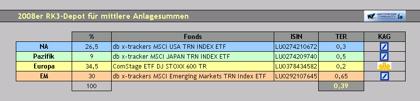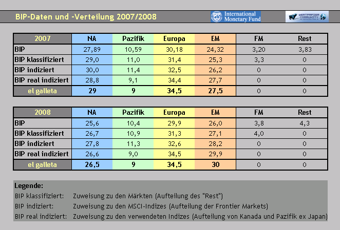 el galleta November 29, 2008 · bearbeitet Dezember 17, 2008 von el galleta ACHTUNG - NEUE VERSION HIER! Ziel: Abgeltungssteuer-Depot 2008 Es wird Zeit, das Jahr neigt sich dem Ende, die Abgeltungssteuer steht vor der Tür - direkt hinter dem Weihnachtsmann. Da sich die SWAP-Steuer-Frage positiv zu lösen scheint und deshalb ein Renditevorteil winkt, habe ich für mich folgende Lösung(en) gefunden: Ausgangspunkt: aktuelle BIP-Daten Ich gehe von den (voraussichtlichen) 2008er BIP-Daten aus, auch weil sie - unter Berücksichtigung der hier nicht angegebenen Daten von 2006 - die Fortschreibung einer erkennbaren Tendenz (USA/NA schrumpft, EM, FM und Rest wachsen) bilden und ich insofern hoffentlich das erste Rebalancing antizipiere. Wie man sich die Zahlen beschafft, beschreibt supertobs in seiner Depotvorstellung sehr schön. Ich baue auf die Angaben des Internationalen Währungsfonds Stand Oktober 2008 auf und orientiere mich wie supertobs an der MSCI-Einteilung. (Im Vergleich zu seinen Beschreibungen auf der Datensbasis 2006 haben sich die BIP-Daten teils deutlich geändert. Der Vollständigkeit halber: Jordanien hat mittlerweile die EM-Gruppe verlassen, was freilich kaum ins Gewicht fällt.) Für die gesicherten Daten des Jahres 2007 und die erwarteten Daten des Jahres 2008 ergibt sich folgendes Bild: Die nicht durch Indizes abgedeckten 8% teile ich im Verhältnis auf. NA und Pazifik werden auf USA bzw. Japan reduziert (s.u. bei Fondsauswahl), die dadurch vernachlässigten je ca. 2,5% von Kanada und Pazifik ex Japan werden ebenfalls im Verhältnis aufgeteilt. Das Depot deckt also in Wirklichkeit nur rund 87% ab. Mir genügt das. Fondsauswahl Die Fonds sind Standard und sicher keine Überraschungen. Als Hilfsmittel zur Auswahl habe ich die Übersicht von smarter-investieren.de, die aktuelle Übersicht handelbarer ETFs (PDF "facts & figures" 3/2008) der Deutschen Börse sowie natürlich die einzelnen KAG-Seiten (db x-trackers, Comstage und Lyxor) verwendet. Für Nordamerika (NA) bestehen zwei Möglichkeiten: Tatsächlich NA nehmen (MSCI NA = USA & Kanada) oder auf den MSCI USA reduzieren, da die USA derzeit (gerade noch) 90% von NA ausmachen. Weil der einzig verfügbare ETF auf den MSCI NA (iShares MSCI North America, DE000A0J2060) ein Drittel mehr kostet (TER 0,4%) und ausschüttet, reduziere ich auf die USA und wähle den db x-trackers MSCI USA TRN INDEX ETF (LU0274210672) mit TER 0,3%. Ich vernachlässige dadurch den kanadischen BIP-Gesamt-Anteil von ca. 2,5% - das scheint mir vertretbar. Über maxblue ist der von mir gewählte Fonds zum Nulltarif zu bekommen. Ähnliches Spiel für die Region Pazifik, allerdings gibt es hier gar keinen Gesamt-ETF, man müsste so oder so "basteln" (was bei mittleren Anlagesummen schnell sinnlos wird). Zwar steht Japan nur für ca. 75% der Region, aber da diese insgesamt nur 10,5% BIP-Gesamt-Anteil besitzt, werden durch die Reduzierung von Pazifik auf Japan lediglich weitere ca. 2,5% BIP-Gesamt-Anteil nicht berücksichtigt. Auch das gönne ich mir. Zwar wäre statt des MSCI Japan der Topix wohl der breitere/bessere Index, aber mit dem db x-tracker MSCI JAPAN TRN INDEX ETF (LU0274209740) erspare ich mir den ausschüttenden Lyxor ETF Japan Topix (FR0010245514), auch weil die TER für beide identische 0,5% beträgt und der MSCI wohl nicht wesentlich schlechter ist. Über maxblue ist der von mir gewählte Fonds zum Nulltarif zu bekommen. Für Europa wähle ich aus Kostengründen statt MSCI den DJ Stoxx 600 als Index und dann natürlich den ComStage ETF DJ STOXX 600 TR (LU0378434582) mit TER 0,2%. Der alternative iShares DJ STOXX 600 (DE) (DE0002635307) schüttet aus und ist mit TER 0,19% nicht spürbar preiswerter. Über comdirect ist der gewählte Fonds bis Jahresende zum Nulltarif zu bekommen. Bei EM wähle ich zur Anbieterstreuung statt des db x-tracker MSCI EMERGING MARKETS TRN INDEX ETF (LU0292107645) mit TER 0,65% die TER-gleiche Alternative Lyxor ETF MSCI Emerging Markets (FR0010429068). Beide sind ausländisch thesaurierende SWAPer. Da der dbx offenbar noch nicht zum Nulltarif über maxblue zu bekommen ist, fällt mir die Wahl des Lyxor auch nicht sonderlich schwer. EDIT: Bei EM wähle ich mangels vernünftiger Alternativen den db x-tracker MSCI EMERGING MARKETS TRN INDEX ETF (LU0292107645) mit TER 0,65%. Leider ist der Fonds offenbar noch nicht zum Nulltarif über maxblue zu bekommen. Für den im kleinen Depot erforderlichen MSCI-World-Fonds sind ebenfalls dbx und Lyxor im Angebot, diesmal für eine TER von 0,45%. Der db x-trackers MSCI WORLD TRN INDEX ETF (LU0274208692) ist allerdings über maxblue mal wieder zum Nulltarif zu bekommen, sodass die Anbieterverteilung zunächst (s.u. bei Anmerkungen und Diskussion) zu Gunsten dbx ausfällt und der Lyxor ETF MSCI World (FR0010315770) erstmal nur zweiter Sieger ist. EDIT: Auch für den im kleinen Depot erforderlichen MSCI-World-Fonds gibt es keine sinnvolle Alternative zu dbx. Glücklicherweise ist wenigstens der db x-trackers MSCI WORLD TRN INDEX ETF (LU0274208692) über maxblue auch zum Nulltarif zu bekommen. Anmerkungen und Diskussionsansätze Mir ist bewusst, dass das mittlere Depot ein Problem bekommt, wenn ein Land aus dem EM-Index aufsteigt und damit aus dem Depot fallen würde. Einen steuerlichen Nachteil sehe ich darin aber nicht: Sollte es ein relevanter BIP-Gesamt-Anteil sein, werde ich das Land (analog Japan) im Rahmen des sowieso steuerpflichtigen Rebalancing (mittels Neuanlagen) einzeln aufnehmen oder (China scheint mir hier mit ca. 7% BIP-Gesamt-Anteil ein Kandidat zu sein) dann doch den Pazifikraum (ex Japan) abdecken - das würde sich dann mit über 10% BIP-Gesamt-Anteil durchaus lohnen. Währungsabsicherung halte ich für verzichtbar, daher erfolgt keine Über-/Untergewichtung - auch nicht im kleinen Depot. Vielleicht greife ich aber der o.a. absehbaren BIP-Entwicklung vor und gewichte USA/NA zu Gunsten von EM etwas tiefer - auch wenn Grumel das zu recht kritisieren würde. Für folgen