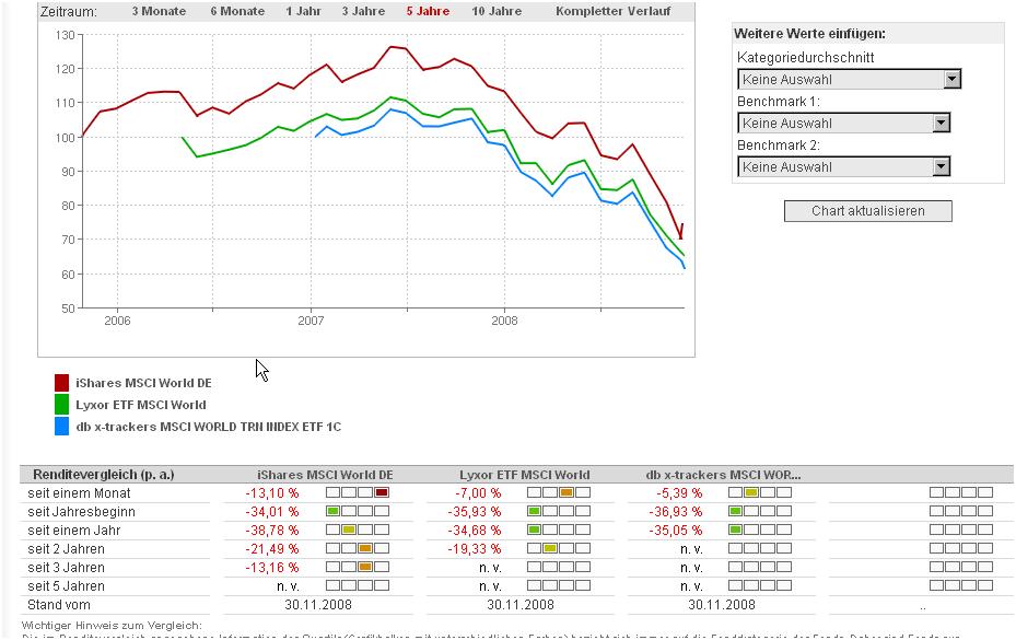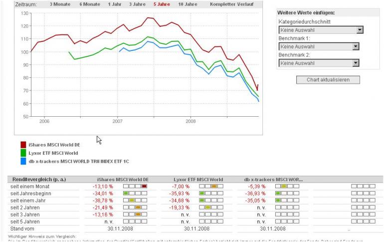 Fohlenboy Dezember 6, 2008 1. Sagte ich, dass sich diese ETF's auf den gleichen Index beziehen. Die Performance der ETF's wird sich langfristig also nicht signifikant unterscheiden. Nur durch die Gebühren und den Tracking Error können kleine Unterschiede auftreten. 2. Wenn du vergleichst, dann bitte richtig. In deinem Vergleich sind die ETF's völlig unterschiedlich auf 100 genormt. Logisch, dass dann nix gescheites bei rauskommt. Im Anhang siehst du einen richtigen 3-Jares und 1-Jahresvergleich Guten Morgen, kannst du mir bitte erklären, wieso dein Fondsvergleich (per Onvista) anders aussieht, als der auf www.fit4fonds.de ? Ich frage dies ernsthaft, denn bislang habe ich nur den dortigen Vergleich zur rate gezogen. Kommt es denn nicht auf die reinen Werte an,in diesem Falle also, dass der Lyxor besser abschneidet als die anderen? Lyxor und IShares beziehen sich beide auf den MSCI World. Ja....genau deswegen komme ja auch die angesprochenen Fonds infrage, weil das genau solche sind, die es bei Flatex ohne jeglichen Ausgabeaufschlag gibt @ el galleta Würdest du dann jetzt in meinem Falle z.B. auf einen weltweiten ETF setzen und kannst du vielleicht auch generell etwas zu meinen Fragen sagen? Danke Diesen Beitrag teilen Link zum Beitrag