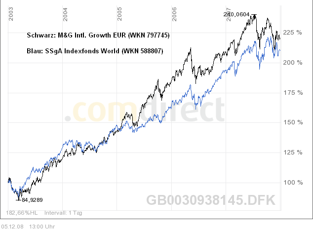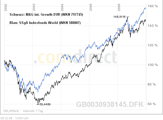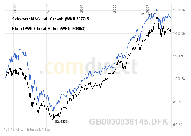Chemstudent Dezember 7, 2008 · bearbeitet Dezember 7, 2008 von Chemstudent Ach Fohlenboy... wann löst du dich denn endlich mal davon, die Vergangenheitsperformance als Hauptpunkt anzuführen? Ist dir klar, dass Performancebetrachtungen IMMER vom Augenblick der Betrachtung selbst abhängen? Im Anhang mal ein Vergleich. M&G gegen den SSgA Indexfonds World (WKN 588807,bildet den MSCI World ab), immer auf 5-Jahressicht. Blau: Indexfonds Schwarz:M&G 1. Bild: Betrachtung mit den Augen eines Anlegers Anfang 2007. Der Indexfonds schlägt den M&G und liegt in der gesamten Betrachungsperiode über ihm. 2. Bild: Ein Jahr später. Betrachtung mit den Augen eines Anlegers Anfang 2008 Der M&G schlägt den Indexfonds. Letzterer liegt fast die gesamte Zeit unter dem M&G. Und noch ein Vergleich. M&G gegen den DWS Global Value (WKN 939853, als ersatz für den Top Dividende), immer auf 5-Jahressicht. Blau: DWS Schwarz: M&G Wir betrachten einmal den 5-Jahresvergleich vom Anfang Oktober 2006. Der DWS schlägt den M&G und liegt wärhend des Betrachtungszeitraumes stets über ihm. Und nun der 5-Jahresvergleich Anfang 2007, also 3 Monate später. Das Bild hat sich deutlich geändert. Nun führt der M&G. Jetzt dürfte dir auffallen, des solche Betrachtungen rein garnix bringen oder? Die Wahl des Bezugspunktes ist entscheidend. Ließ dir den Verkaufsprospekt des M&G durch. Du wirst feststellen das er nicht in England investieren darf. Ob man das will oder nicht ist jedem selbst überlassen. Wegen den ETF's: Mir kommt es irgendwie so vor, als wüsstest du garnicht so richtig, was die ETF's überhaupt nachbilden. Dort wird nicht aktiv nach "guten" Aktien gesucht. Da gibt es keinen Manager der ein großes Research betreibt. Sie bilden simpel einfach ein Index nach. Der Index berechnet sich nach festen Regeln. (wie z.b. der DAX) Weil das Management wegfällt, sind ETF's (genauer: passive ETF's) auch so günstig. Diesen Beitrag teilen Link zum Beitrag