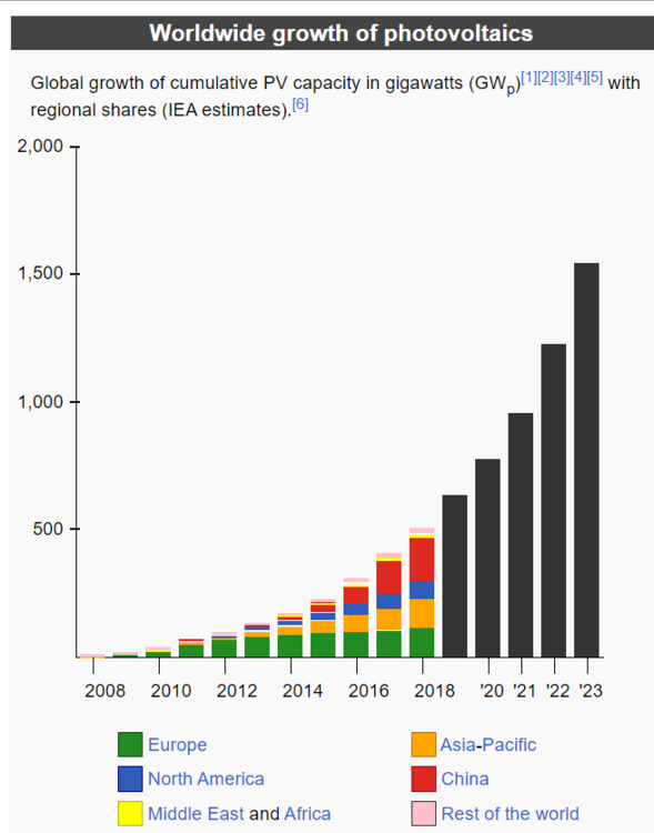 slowandsteady Mai 2, 2023 Vielleicht sollte @reko mal den Führern anderen Ländern mitteilen (insb. China), dass Erneuerbare nicht durchgehend Strom erzeugen. Was Deutschland macht, ist weltweit schon längst irrelevant, unser Zubau an Erneuerbaren stagniert bzw. sinkt sogar bei Windkraft. Selbst prozentual zum Stromverbrauch waren wir mal "Führer" bei den Erneuerbaren, jetzt fallen wir auf "ferner liefen" zurück. Ich lasse mal 2 Grafiken da (beide von Wikipedia, siehe Links oben): Growth of photovoltaics - Wikipedia Wind power by country - Wikipedia Diesen Beitrag teilen Link zum Beitrag
