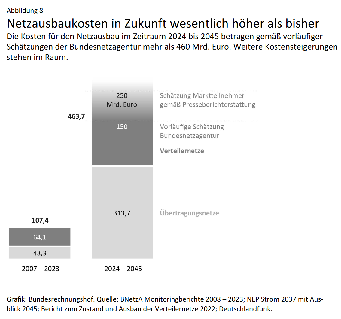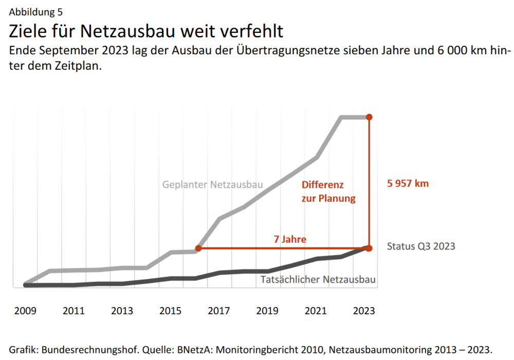 reko März 9, 2024 · bearbeitet März 9, 2024 von reko Bundesrechnungshof: Schleppender Netzausbau und zu hohe Stromkosten für Verbraucher und Industrie. 2024/03/07 Energiewende nicht auf Kurs: Deutschland hinkt seinen ambitionierten Zielen hinterher .. Bis zum Jahr 2045 fallen allein für den Ausbau der Stromnetze massive Investitionskosten von mehr als 460 Mrd. Euro an. Das BMWK berücksichtigt diese Systemkosten bisher nicht bei seiner Darstellung der Kosten für Strom aus erneuerbaren Energien. .. Fazit „Unser Bericht zeigt: Die bisherigen Maßnahmen zur Umsetzung der Energiewende sind ungenügend und bergen deshalb gravierende Risiken für die energiepolitischen Ziele“, warnt Scheller. bundesrechnungshof.de .. Berichte/2024/energiewende-volltext.pdf Diesen Beitrag teilen Link zum Beitrag