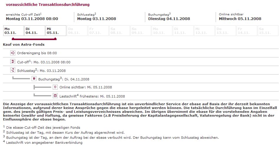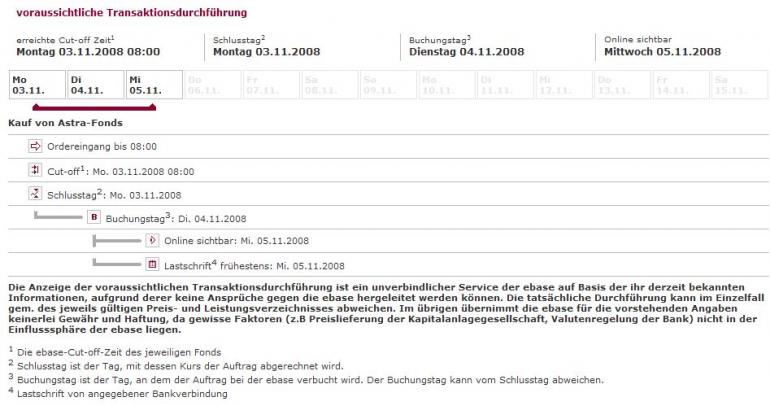 Padua November 4, 2008 ebase verwaltet derzeit für mich 10 Fonds. Bei allen 10 Fonds hat sich die Cut-off-Zeit für das "Forward-Pricing (Bestellung Tage vorher)" nicht geändert. Ansonsten finde ich die Transparanz bei ebase-Käufen vorbildlich. Bevor ich einen Kauf bestätige, sehe ich: Forward-Pricing (Bestellung Tage vorher) Preislieferung der KAG (Lieferung Tage später) Valuta Kauf (Tage später) Valuta Verkauf (Tage später) Gelungen find ich auch die "Service Timeline". Hier sieht man auf einer Zeitschiene den genauen Ablauf des Kauf- oder Verkaufvorgangs. Auf diese Daten konnte ich mich bislang immer verlassen. Beispiel: Gruß Padua Diesen Beitrag teilen Link zum Beitrag