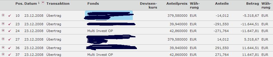 Wie bereits weiter oben ausführlich vermutet, kann ich heute in meinem ebase Depot folgendes erkennen: alle alten Depotpositionen stehen auf 0 Anteilen, dafür sind mit höheren Nummern neue Positionen angelegt, in die diese Anteile verschoben wurden. Positionen die nach der Umstellung am 22 12 2008 noch durch Käufe, Umschichtungen und Übertragungen neu im Depot aufgemacht wurden, sind nicht "verdoppelt" worden. Sinnvollerweise geht man sein Depot also von unten nach oben (absteigende Positionsnummern) durch: zu jeder mit Anteilen gefüllten Position muß man eine Position mit niedrigerer Nummer finden, die leer ist. Dann war die Bestandstrennung erfolgreich. In die alten, kleinen Positionsnummern kommen - meine Vermutung - die Wiederanlagen der Ausschüttungen oder Nachkäufe in 2009 ff rein. Wegen last-minute-Käufen finde ich zu einigen Fonds bei mir keine solche leeren Positionen. Daher fülle ich das Formular zur Bestandstrennung nochmal aus, notiere hier nur jene Positionen, zu der kein Zwilling da ist, und schicke das ganze per FAX vor den ersten Ausschüttungen oder Nachkäufen zu ebase. Über andere Erfahrungsberichte mit der nachträglichen Bestandstrennung freue ich mich.