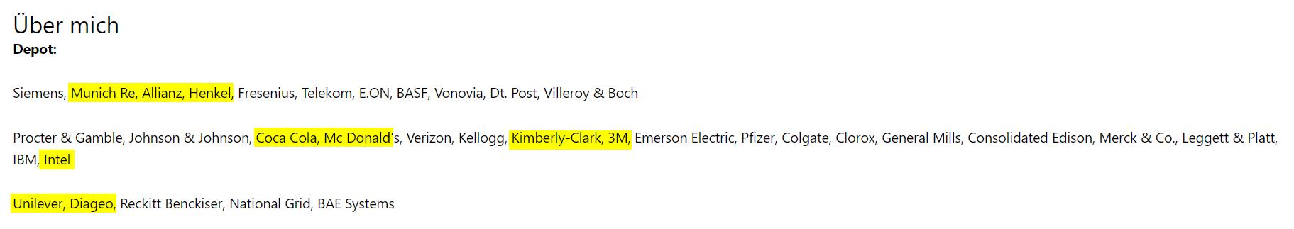 Cinquetti November 7, 2022 @sedativ Schönes Depot Die gelb hervorgehobenen Aktien habe ich auch: Colgate, General Mills & Procter & Gamble sind auf meiner Watchlist ziemlich weit oben. Die Idee mit dem Depot im Profil finde ich gut, das werde ich auch so machen. Diesen Beitrag teilen Link zum Beitrag