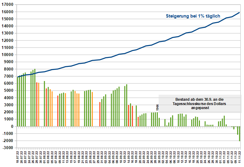 tradefrog November 12, 2022 folgender zeitplan: rückblickend analysiert, gab es eine ähnliche situ, von feb bis mai 2020, wo eine trendumkehr, bei euro/usd stattfand... auch da war ein spike, in vorliegender höhe, vorhanden... es hat aber 9 wochen gedauert, mit immer wiederkehrenden schwüngen, zum boden (wo der frogentry ist), bis die thermikblase, abgehoben hat... merke: eine trendumkehr passiert nicht, über nacht, das dauert wochen, bei forex... die nächsten 3 wochen, werden froggy's theorie, bestätigen... dann bleiben, mit den geretteten 2k, nur mehr 4 wochen bzw 20 handelstage, aber mit 20%tgl, sind noch 4k/8k/16k/32k möglich... für die 100k wären 5,5 (in 20ht) verdoppelungen notwendig... was ca 27%tgl nötig machen würde... solange wir spätestens, mit dezember, und dem 2k tradecash, die weihnachtsrally starten können, sieht froggy, immer noch, die chance, sein ziel, zu ereichen... sobald das zeitfenster, aber auf 6 tage geschrumpft ist, muß er sich geschlagen geben, da 100%tgl, dzt außerhalb, seines tradevermögens liegt und nicht einmal, mit einem 24/5 job, zu schaffen wäre... Diesen Beitrag teilen Link zum Beitrag