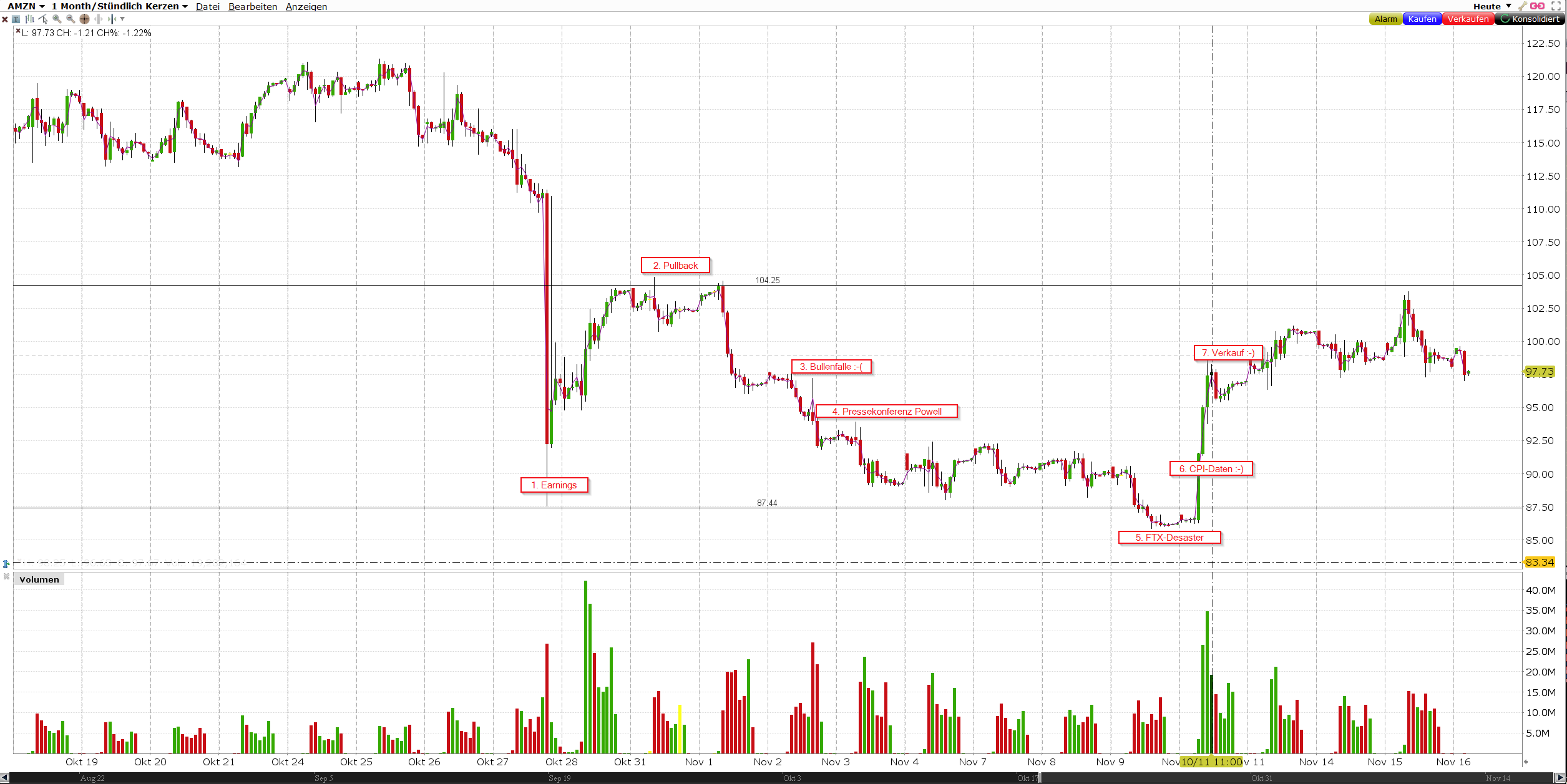 Cinquetti November 16, 2022 @tradefrog Das war kein schöner Trade und ich bin nicht stolz darauf. Ich bin hier in eine klassische Bullenfalle reingelaufen Nach den Earnings ist die Aktie auf bis zu 87,44$ gefallen, das war für mich die Unterstützung. Danach gab es ein Bounce nach oben auf über 104$, das war für mich der Widerstand. Am 2. November gab es die FED-Tagung. Ich hatte mich hierfür vorbereitet und wollte die evtl. kommende Rallye mittraden. Der Markt war euphorisch, weil die FED die Zinsanhebungen verlangsamen wollte. Die Aktie ist von ihrem Tagestief bei 94$ auf über 97$ marschiert. Bei 96,19$ habe ich den Trade eröffnet in der Hoffnung 100-200$ Profit zu machen. Ich habe allerdings nicht mit Jerome Powell gerechnet - das war mein 1. Fehler. Powell hatte sehr schlechte Laune auf der Pressekonferenz. Als er auf die Rallye angesprochen wurde, die da gerade stattfand, war er sehr hawkish und hat betont, dass er die Inflation mit allen Mitteln auf 2% bringen würde. Das wiederum hat dem Markt nicht gefallen und der gesamte Nasdaq ist daraufhin abgetaucht. Mein 2. Fehler war, dass ich nicht wahr haben wollte, dass Powell so eine Macht über den Markt hat. Ich war 200$ im Minus an dem Abend und dachte, das wird sich am nächsten Tag schon erholen ... Pustekuchen. Ich hatte meinen S/L sehr tief bei 83$ positioniert, weil ich an Amazon glaube. Das ist der einzige Techwert in meinem Buy & Hold-Depot. Ich war bereit die Show auszusitzen, in der Hoffnung, dass sich der Markt wieder erholt. Normalerweise dauert es 3 Tage, bis so eine FED-Pressekonferenz verdaut ist. Dann kam das Dilemma mit FTX. Das war ein richtiger Nackenschlag für die Tech-Aktien. Hier wurde die Unterstützung gebrochen. Kein gutes Zeichen. Und ich hatte an dem Tag wirklich schlechte Laune ... Was den "Trade" dann gerettet hat, waren die Inflationsdaten und der dann folgende Short-Squeeze. Das war reines Glück. Einen Tag später habe ich die Aktie bei 98,60$ verkauft. Hier ist der ganze Verlauf auf dem Chart zu sehen: Diesen Beitrag teilen Link zum Beitrag