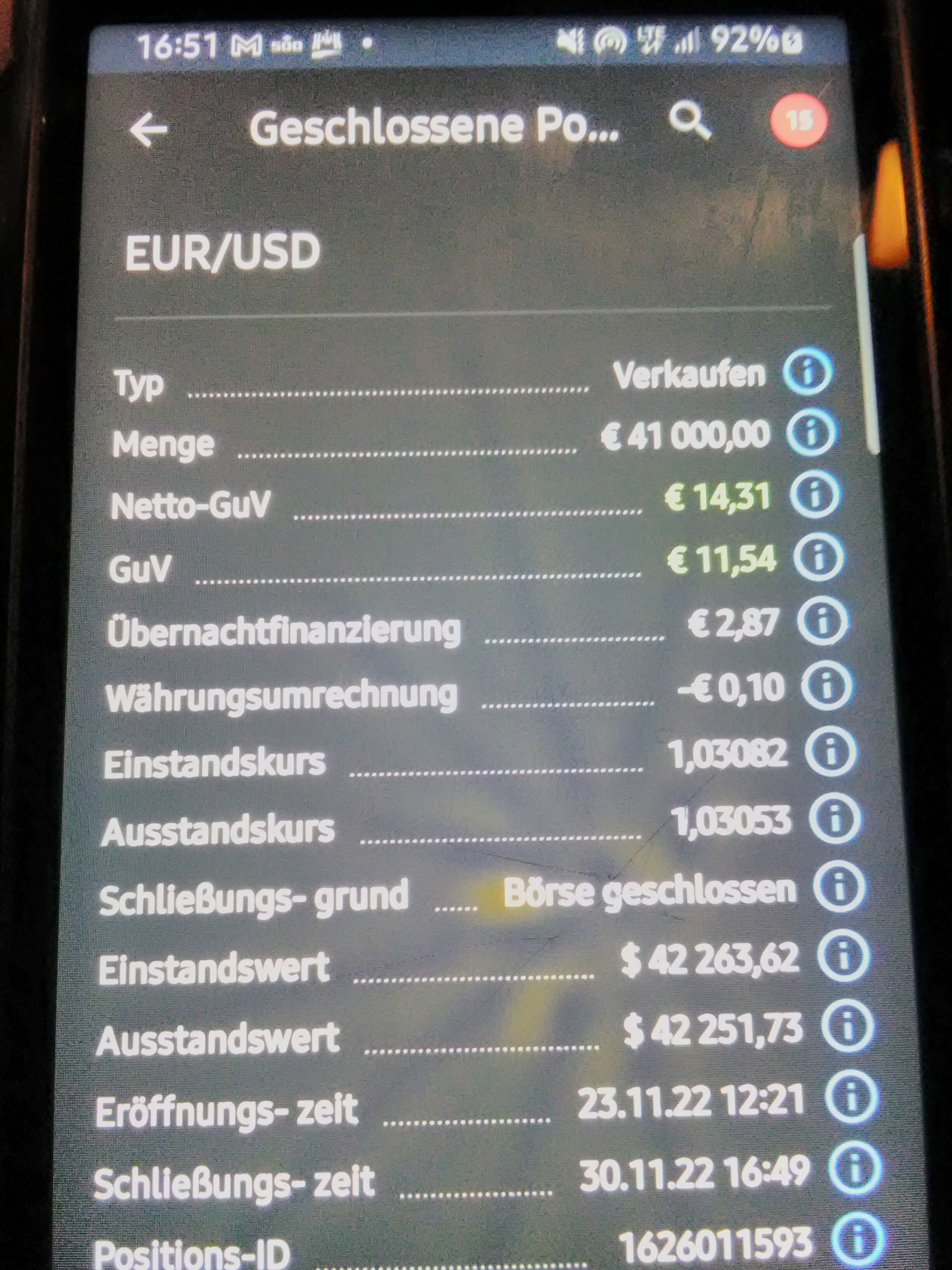 tradefrog November 30, 2022 das ist der letzte minustrade, der solange auslauf kriegt... alle weiteren werden, innerhalb des tages, bzw innerhalb 1-2 stunden geschlossen, da der zeitverlust, an der tagesperformance nagt... froggy will, da sein short, charttechnisch bestätigt ist, nur plus sehen... dzt 250€ minus... der table top (resist) bei 1,03942, wird dzt nicht gebrochen und der nächste down, zur primetime, sollte das plus besiegeln... ab morgen sind's noch 22 handelstage... mit 25%tgl (doppler alle 4 tage) gehn sich die100k nicht aus... mit 33%(doppler alle 3 days) schon... aber zuerst, muß froggy, raus sein... Diesen Beitrag teilen Link zum Beitrag