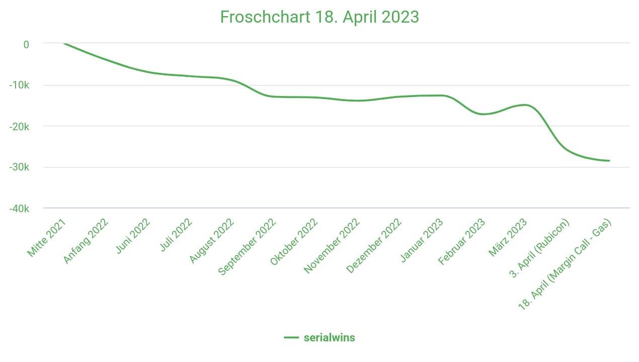 tradefrog April 19, 2023 froggy hält die show am laufen... auch ohne nachschuß... es gebührt dem gelübde, daß heuer nichts mehr eingezahlt wird und das ist auch gut so... dieser einzahlungsstop zwingt froggy zu umsichtigerem handeln, was aber nicht heißt, daß er jetzt leiser tritt, wie slowhand vorschlägt... nein, nur wird er des öfteren, mittels manuellem stoploss schließen, wenn er erkennt, daß er falsch liegt (siehe gestern)... dadurch reduziert sich die gefahr, eines halfings um 100%... na, wenn das kein fortschritt ist, was dann?... das letzte abendmahl wird so oder so, nicht opulent ausfallen... denkt slowhand, froggy zieht sich dabei, gleich 5liter olio sasso, in die gedärme?... froggy wird heuer, bis zum letzten cent traden, da könnt ihr sicher sein... Diesen Beitrag teilen Link zum Beitrag