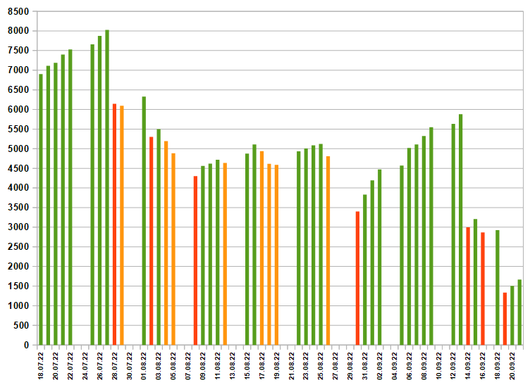 tradefrog September 23, 2022 froggy kämpt um jeden cent( (marktwert)... 8€ plus dann 2€ minus/1 cent, nach 90 minuten... wie kam das?... aufgrund der ca 31 serialwins, mußte ein einstelliges minus her... weil, wenn man immer nur plus macht, verpasst man swingchancen, die vor der nase tanzen.... zb der letze trade war mit ca 200cent swing summe, ca 400€ profitabel (theoretisch).. wenn der down zu senkrecht ist, dann bildet er einen boden, mit einer seitwärtsbewegung, bis er eine, den preis begleitende ma trifft... dann geht der weiter down, wie gerade eben... froggy hätte nur drinnen bleiben müssen... andererseits könnte so ein längerer slide nach rechts, auch einen uptrend/repull einleiten... solche side-swings traden kann profitabel sein.... besser als ein falling knife,wo du nicht abschätzen kannst ob er nicht bei deinem entry blitzschnell uturnt, und du ins minus rutscht... ist's a chessmatch... du und der markt... ein spiel der nerven, aber kein glückspiel... aber glück schadet nie... konto dzt 1,8k ... wochentief war 1,3k... 500€/25% bereits recovert.. hätte mehr plus sein können, aber auch mehr minus.... ist wie beim wingtsun... der anfänger geht aggressiv in den markt, der profi versucht den markt und seine bewegungen zu kontrollieren.. macht zwar weniger fortschritte, wie ein wilder lucky puncher, aber minimiert dadurch sein risiko.. bei einer wilden schlägerei im markt, entstehen blößen, die schwer zu verteidigen sind und dann gegügt eine unachtsamkeit und der bigloss ist da... so wir sind bereits beim "alltime low" mit 81,50dollar angekommen.... froggy's downtrend-prognose "is still alive!" seit14. juni (ca70handelstagen)... der 82,59 exit war wie man sieht zu früh... "rsi" ist bereits unter 30 (überverkauft) und jetzt besteht repullgefahr... falling knifes sind verlockend, aber das sind sirenen auch und dann hängst du im film: "margincall"... Diesen Beitrag teilen Link zum Beitrag