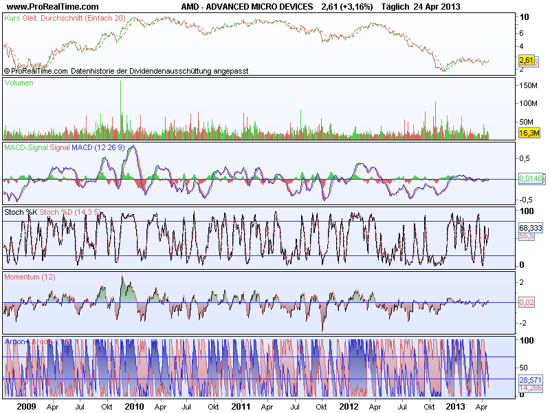 Sthenelos April 25, 2013 AMD seit Ende letzter Wo. auch in meinem Depot, war lange auf der Wotschliste, jetzt schien mir der Zeitpunkt gut und die Kursgewinne der letzten Tage waren ersklassig! Die Nachricht bzgl. der Spielekonsolen ist im Kurs enthalten oder eben auf dem Markt bekannt, das Ergebnis noch nicht. Die Spielekonsolen werden m.A. in der Zukunft deutliche Marktanteile verlieren - wie bisher, gegen Tablets. Tablets werden Konsolen mehr und mehr ersetzen, vermutlich wirds auch bald richtige Multiplayerfähige Gametablets geben wie einst früher zu "Lan Zeiten" am Computer. Konsolen werden nicht aussterben, aber ich sehe keine Möglichkeit Ergebnisse einzufahren wie vor zig Jahren es üblich war. AMD hat einige paralellen mit Nokia - auch vom Chart. Beide AGs kämpfen, beide können mit Zahlen oder fund. Fakten noch nicht wirklich überzeugen, beide erzeugen auf dem Markt aber Hoffnung durch neue Produkte. Chart bei AMD war für mich auch ein wesentlicher Grund zu kaufen, der gefällt mir. Momentum seit Ende 2011 steigend, keine neuen Lows mehr dort, MACD derzeit auch im guten Bereich, keine Angst mehr in dieser Aktie, keine Panik, das schlimmste ist vorerst vorbei. Wunschkursziel wären 4 Dollar - aber so schnell gehts natürlich nicht. Werde AMD nicht über Jahre halten, geplant ist jetzt einmal Monate, dann werde ich je nach Entwicklung eine Tranche verkaufen. Diesen Beitrag teilen Link zum Beitrag
