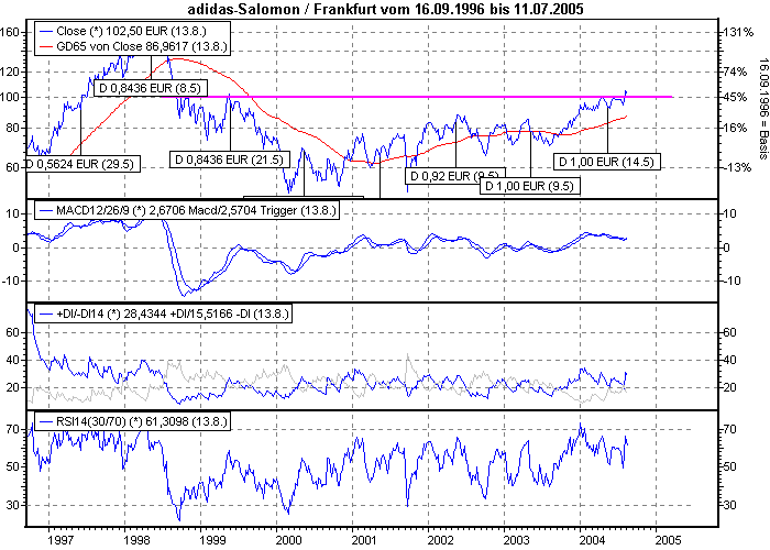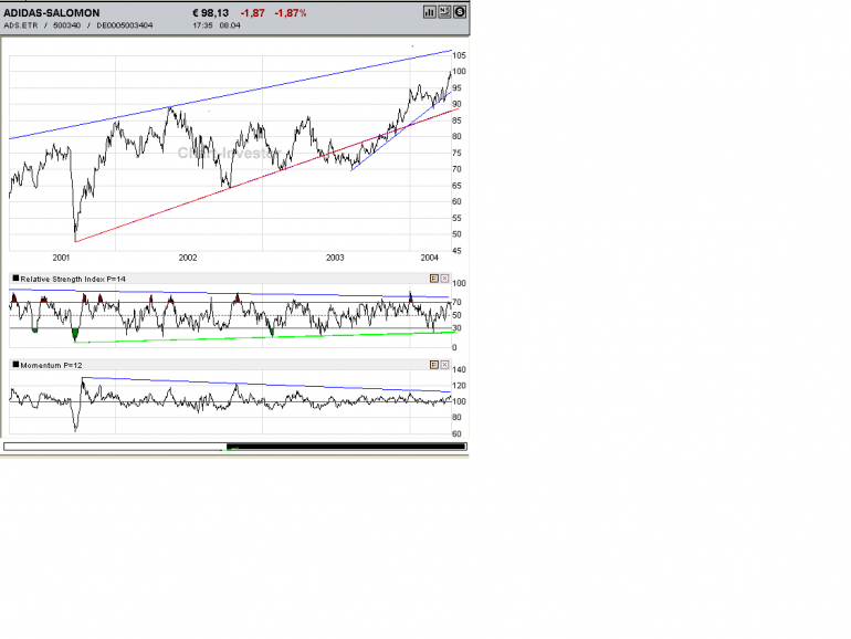 andy April 11, 2004 Da Adidas Salomon im Moment an der 100er Marke krazt, hab ich mir mal den Chart vorgenommen! Wie seht ihr denn die Aktie, wird sie die 100 Marke schaffen? Diesen Beitrag teilen Link zum Beitrag