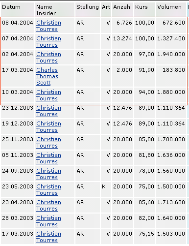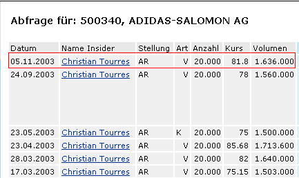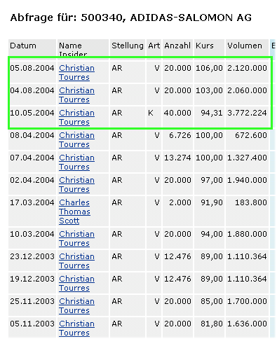 Aktiencrash August 18, 2004 In vielen Fällen werden Widerstände kurz nach oben durchbrochen. Dies dient oft zur Täuschung, wobei man erreichen möchte das Anleger kaufen sollen. Danach kann es wieder unter diesen gehen. Es gibt Analysten die werden von Bankhäusern bezahlt. Wenn die Aktien z.B. an den Mann/Frau bringen wollen, dann überhäufen die einen ständig mit Kaufempfehlungen. Man sollte dieser bezahlen Analystengemeinde mit Vorsicht begegnen, da sie einen oft/sehr oft verschauckeln. Was is das für eine Liste die du da hast? Und wer ist dieser Christian Tourres ??? Der sitzt im Aufsichtsrat bei Adidas und ist somit ein sog. Insider. Insidergeschäfte sind nach § 15a WpHG (Directors' Dealings) meldepflichtig. Du findest die Daten zum einen hier: http://www.bafin.de/database/p15a_info/front?action=start oder hier http://www.insiderdaten.de/ Diesen Beitrag teilen Link zum Beitrag