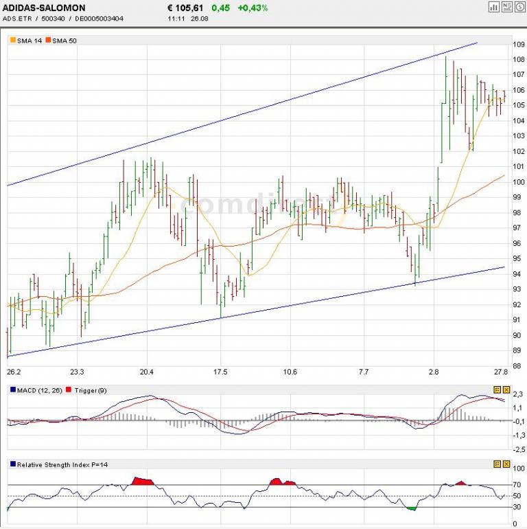 Rathi August 18, 2004 Hi Leute, bin gestern auf euer Forum gestoßen und ich darf euch zunächst mal ein großes Kompliment machen. Eine super Sache !!! Ich wollt einfach mal fragen was ihr denn von der Adidas haltet und wies Charttechnisch aussieht. Ich bin leider noch absoluter Anfänger auf diesem gebiet aber anscheinend sind hier ein paar Profis unter euch die dieses Handwerk beherschen. Letzte Woche hat es ja einen sprunghaften Anstieg der Adidas-Aktie gegeben. Im laufe der letzten Woche haben 6 Analysten eine Kaufempfehlung ausgesprochen (z.B. Merrill Lynch, Wirtschaftswoche,...). Ist der Preis der Aktie eurer Meinung nach schon zu hoch, oder geht der Trend nach oben weiter. Soweit ich mir die Chartanalsye jetzt mal angeeignet hab würd ich sagen: Der MACD steht weitehin für einen Aufwärtstrend da er im positiven Bereich und über dem Trigger verläuft. Der RSI spricht zwar dagegen, hat aber den "überkauften" Bereich schon wieder verlassen. Und vielleicht entwickelt sich ja aus dem Chart noch ein Wimpel welcher dann erneut für steigende Kurse stehen wird. Wäre sehr nett wenn ihr eure Meinungen schreiben würdet. Es würde mich auch freuen wenn ihr euch mal meine "Chartanalyse" durchlesen könntet und mir schreibt ob ich da was falsch mache oder ob sowas für einen Anfänger ok is. Freue mich natürlich auch über Kritik.... (maja, vielleicht wär mir ein kleines Lob doch lieber ) Schöne Grüße, Rathi Diesen Beitrag teilen Link zum Beitrag