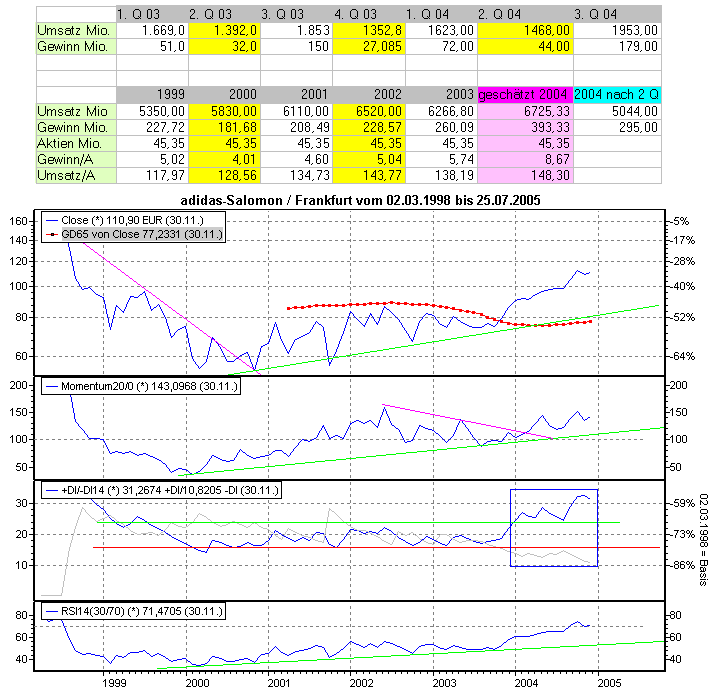Aktiencrash November 6, 2004 Charttechnisch scheint um die 100 ein Widerstand (violett) zu liegen. Sollte die Aktie sich über diesen halten dürfte alles in Butter sein. Würde daher ein SL unter 100 letzten. Die Aktie hat sich bisher locker über 100 gehalten ! Am 3. Okt. 2004 sind nun die Zahlen für das 3. Quartal von Adidas veröffentlicht worden. Im ganzen sind die zahlen positiv ausgefallen. Der Gewinn konnte deutlich zum 3. Q. 2003 gesteigert werden. Der Umsatz legt ebenfalls zu. Nach meiner Einschätzung dürfte der Umsatz für 2004 zwischen 6396,80 Mio. bis 6725,33 Mio. und der Gewinn zwischen 322,09 Mio. bis 393,33 Mio. liegen. Das ist in zum Jahr 2003 gesehen in jeden Fall eine Steigerung. Geht man jeweils von der Obergrenze der zu erwarteten Steigerung (Umsatz und Gewinn) aus, dann liegt das KUV bei 0,75 und das KGV um die 12,79 (Kurs 110,90 ). Charttechnisch sieht es denke ich im augenblick auch gut aus. Nach dem das Momentum die negative Divergenz (violett) nach oben durchstoßen hat, scheint sich eine langfristig pos. Konvergenz (grün) rausgebildet zu haben. Bisher gibt es zwei Bestätigungen für die Konvergenz. Der +DI/-DI überzeugt ebenfalls auf langfristige Basis. Dazu hier meine Theorie: 1.Ein dynamischer Aufwärtstrend entsteht, wenn gleichzeitig +DI (blau) über 25 steigt (grüne Linie) und -DI (grau) unter 16 fällt (rote Linie). 2. Ein dynamischer Abwärtstrend entsteht, wenn gleichzeitig +DI (blau) unter 16 fällt (rote Linie) und -DI (grau) über 25 steigt (grüne Linie). 3. Ein Trend wird beendet, wenn sich +DI und -DI gleichzeitig zwischen der grünen und roten Linie bewegen (zwischen 16 und 25). Es sollte zu einem Seitwärtstrend kommen. 4. Eine Trendabschwächung in die jeweilige Richtung besteht, wenn sich nur einer der beiden Werte (+DI oder -DI) zwischen den Linien grün und rot bewegt. Nach dieser Theorie liegt Punkt 1 vor (blaues Rechteck) Der RSI überzeugt mit seiner langfristigen pos. Konvergenz (grün) am längsten. Seit dem Jahr 2000 steigt diese und wurde bisher 5 mal bestätigt ! Fazit: Die fundamentalen Daten konvergieren mit den charttechnischen Daten, was denke ich positiv zu werten ist. Ich sehe daher im Augenblick langfristig noch Kurssteigerungspotenzial für die Adidas Aktie. Diesen Beitrag teilen Link zum Beitrag