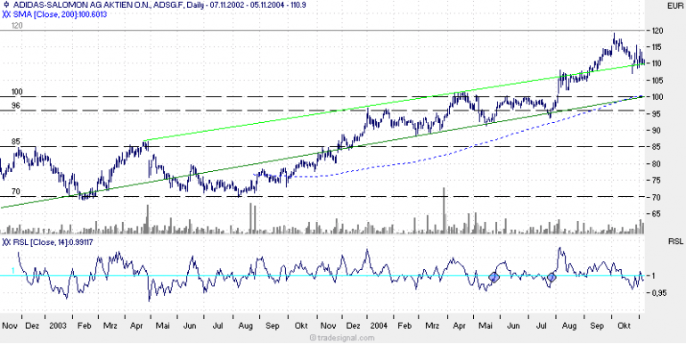 Teletrabbi Oktober 3, 2003 Harte Zeiten für den Herzogenauracher Sportartikelhersteller: Die Geschäfte stagnieren, in den USA ist man vom Wachstumspfad abgekommen. Der Trend zu mehr Preisbewusstsein macht Adidas zu schaffen. Was man in den USA nicht schafft, dass versucht man in Asien und Europa wieder herauszuholen. Die Aktie dümpelt seit Jahren eher seitwärts. Gibt es positive Aussichten? Das lässt sich noch nicht sagen. Die Olympischen Spiele und die Fussballeuropameisterschaft werden das Geschäft sicherlich ankurbeln. Doch diese Ereignisse gab es in den letzten Jahren auch schon und trotzdem ist der Kurs nicht in die Gänge gekommen. Die Aktie: Indikatoren, Durchschnitte und der gesamte Kursverlauf sind sehr unspektakulär. Es geht richtungslos seitwärts. Zwischen 1999 und heute ist der Kurs nur zwischen 50 und 100 Euro geschwankt. Fundamentale Bewertung: Das Unternehmen ist and er Börse 3,5 Mrd. Euro wert. Die Werte in der Bilanz liegen (inklusive der etwa 1,4 Mrd. Schulden) bei ca. 2,8 Mrd. Euro. Die Aktie ist somit fair bewertet, da kein spektakuläres Wachstum zu erwarten ist. Das KGV-04liegt bei 12, die Dividendenrendite bei 1,5 Prozent. Fazit: Eine der langweiligsten Aktien Deutschlands momentan. Diesen Beitrag teilen Link zum Beitrag