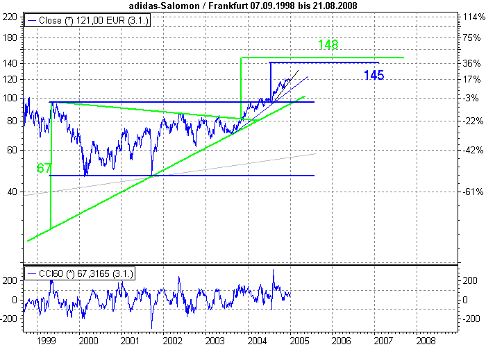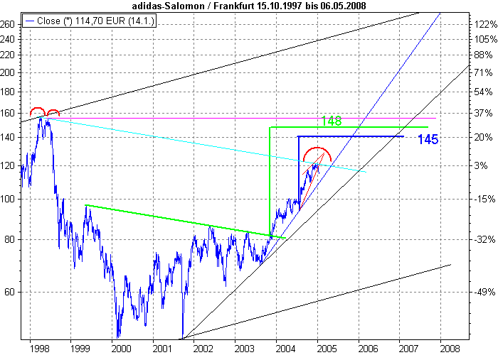 Aktiencrash Januar 16, 2005 Eine interessante charttechnische Stellung ist bei der Adiadas Aktie entstanden. Die Aktie ist nicht nur aus einer nach nach oben laufenden Keilformation nach unten ausgebrochen, sondern ist auf langfristiger Basis an einem signifikanten Abwärtstrend (hellblau) angestoßen und abgeprallt. Wie sich der Abwärtstrend zusammenfügt ist mit roten Halbreisen markiert. Die exakt gleiche Chartstellung hat sich auch im im Dax (Okt. 2004) ergeben. Es kam hier zu einem kurzfristigen Kursrückgang des Dax mit anschließenden Raketenstart. Das läßt hoffen das der Aufwärtstrend (blau) einen erneuten Aufprall aushalten sollte. Das Kursziel sehe ich weiterhin bei 145-148 . Am 27. Januar sollten die Zahlen zum 4. Quartal kommen. Diesen Beitrag teilen Link zum Beitrag