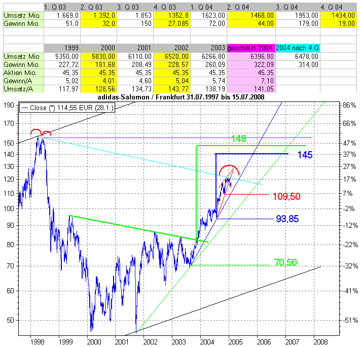 Aktiencrash Januar 30, 2005 Rekordgewinn für adidas-Salomon in 2004 http://www.adidas-salomon.com/de/news/arch.../2005_01_27.asp Nach meiner Einschätzung dürfte der Umsatz für 2004 zwischen 6396,80 Mio. bis 6725,33 Mio. und der Gewinn zwischen 322,09 Mio. bis 393,33 Mio. liegen.Das ist in zum Jahr 2003 gesehen in jeden Fall eine Steigerung. Vorläufige Zahlen Umsatz: 6478,00 Mio (6266,80 / 2003) Gewinn: 314,00 Mio. (260,09 / 2003) Damit liegt der Umsatz in der von mir berechneten Spanne. Der Gewinn läßt jedoch meiner Meinung nach etwas zu wünschen übrig. Ich habe hier einen größeren Quartalsgewinn als nur 19,00 Mio. erwartet. Immerhin lag das Vorjahresquartal bei guten 27,085 Mio. . Prognosen von Adidas 2005: 2005 wird wieder ein außerordentlich erfolgreiches Jahr für adidas-Salomon werden. Wir gehen beim Konzernumsatz von einem währungsbereinigten Wachstum im mittleren bis hohen einstelligen Bereich und beim Gewinn von einer Steigerung zwischen 10% und 15% aus." Quelle: http://www.adidas-salomon.com/de/news/arch.../2005_01_27.asp Für den Gewinn würde das 345,4 Mio. (10 %) und den Umsatz (mittleren bis hohen einstelligen (5 %) 6801,9 Mio. bedeuten. Nach den Qartalszahlen ist das.... KGV 16,54 KUV 0,80 ....bei einem jetzigenKurs von 114,55 Zum Vergleich Puma (188,10 ) KGV 12,45 KUV 2,05 Vom KGV sind beide Aktien fast gleich bewertet, allerdings ist ein KUV von 2,05 doch schon sehr hoch. Aus fundamentaler Sicht ist ein KUV <1 günstig. Somit spricht einiges für die Adidas Aktie, wenn man es aus fundamentaler Sicht betrachtet. Eine interessante charttechnische Stellung ist bei der Adiadas Aktie entstanden.Die Aktie ist nicht nur aus einer nach nach oben laufenden Keilformation nach unten ausgebrochen, sondern ist auf langfristiger Basis an einem signifikanten Abwärtstrend (hellblau) angestoßen und abgeprallt. Wie sich der Abwärtstrend zusammenfügt ist mit roten Halbreisen markiert. Bisher hat die Aktie dem hellblauen Abwärtstrend nichts entgegenzusetzten. Charttechnisch gibt es zur Zeit drei horiz. Unterstützungen. Zum einen die kurzfristige bei 109,50 , die mittelfristige im Bereich von 93,85 und zu guter letzt die langfristige hori. Unterstützung von ca. 70,50 . Bisher ist eigentlich nur die kurzfristige Unterstützung von 109,50 in Gefahr. Zu gute kommt hier allerdings der Aufwärtstrend (blau), der Unterstützung geben könnte für die nächste Zeit. Fazit: Kurzfristig sollte man den Durchbruch durch den Abwärtstrend (hellblau) abwarten, denn es könnte hier durchaus zu einer Seitwärtsbewegung in nächster Zeit kommen. Auf langfrisitge Sicht sehe ich persönlich weiterhin ein Kursziel von 145-148 . Diesen Beitrag teilen Link zum Beitrag