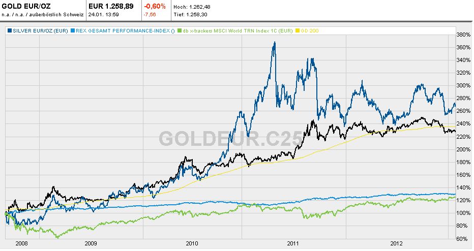Kleine Chart Spielerei: Entwicklung von Gold/EUR, Silber/EUR, RexP und MSCI World seit Sept. 2008 (Lehman Pleite). Konkrete Kauf-/ Verkaufsabsichten würde ich daraus allerdings nicht ableiten wollen...