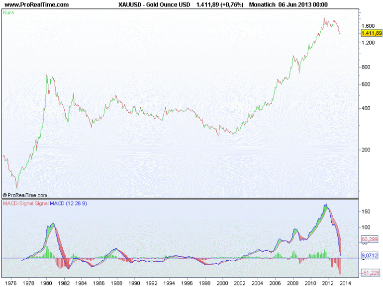 Maciej Juni 7, 2013 Scharfe Worte, wenn man bedenkt, dass du hier von einem 6monatigen Korrektur-Trend auf den 12jährigen Primärtrend schließt. Letzterer ist, wenn auch etwas angeschlagen, technisch noch intakt. Noch ... da ist nichts mehr intakt, die Würfel sind gefallen. Anscheinend haben wir unterschiedliche Ansichten, wann ein Trend als gebrochen gilt. Nach meiner wurde das letzte maßgebliche Tief knapp über 1300 USD noch nicht unterschritten: Wo und wann wurde der Trend aus deiner Sicht gebrochen? Diesen Beitrag teilen Link zum Beitrag