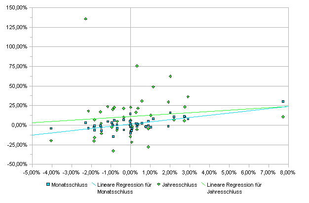 Maciej Januar 5, 2014 Da an verschiedenen Stellen schon wieder gejubelt wird, hat mich mal interessiert, ob der positive Start des Goldpreises ins neue Jahr nun ein gutes oder schlechtes Omen für das kommende Jahr ist. Darum hab ich mal zurückgerechnet, wie sich Gold zwischen 1970 und 2013 jährlich in Abhängigkeit vom ersten Handelstag im Jahr entwickelt hat. In der ersten Grafik ist auf der x-Achse die prozentuale Veränderung am ersten Handelstag eines Jahres und auf der y-Achse entsprechend die Veränderung bis Ende Januar bzw. bis Ende des zugehörigen Jahres dargestellt. In der zweiten Grafik das gleiche Spiel, nur dass auf der x-Achse hier die Gewinne/Verluste vom Januar und auf der y-Achse die bis Jahresende aufgetragen sind. Zur Verdeutlichung der Tendenz sind jeweils noch die Ausgleichsgeraden eingezeichnet. Was sagt uns das Ganze? Ich finde nicht viel, schon gar nicht auf Jahressicht. Auf Monatssicht liegen die Punkte doch einigermaßen nah an der Ausgleichsgeraden. Ausgehend vom diesjährigen Jahresstart von +1.44% liegt der Erwartungswert bis Monatsende also irgendwo bei 5%. Also Gold long bis Ende Januar - wer traut sich? Diesen Beitrag teilen Link zum Beitrag