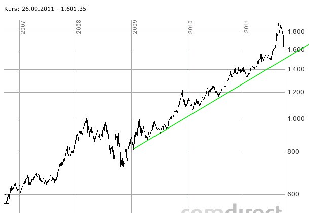 Selbst wenn es wie 2008 korrigiert muss man einfach cool bleiben. Damals ging es von 1000 auf 750. Die gleiche Relation heute angewendet ergibt 1350.