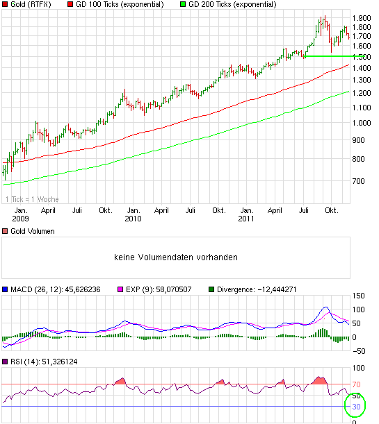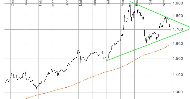 losemoremoney November 21, 2011 Es ist ein symmetrisches Dreieck entstanden: Nach TA-Regeln müsste der Ausbruch nach oben oder unten noch im November erfolgen, wenn ich mir ansehe, wie weit das Dreieck schon entwickelt ist... Ist mir auch schon aufgefallen, bei Trendbruch nach unten gehts bis 1400-1500 runter dann sind wir auf Wochenbasis überverkauft. Bei 1200 liegt ne Unterstützung aus 2009. Ich habe genug von den Zeugs und werde jetzt regelmäßig Silber kaufen, egal ob der Preis fällt oder nicht. Diesen Beitrag teilen Link zum Beitrag