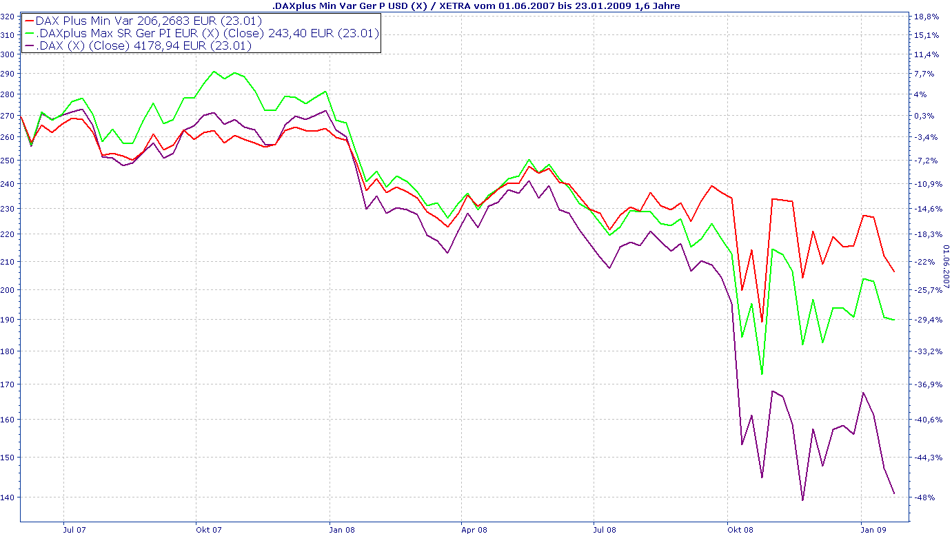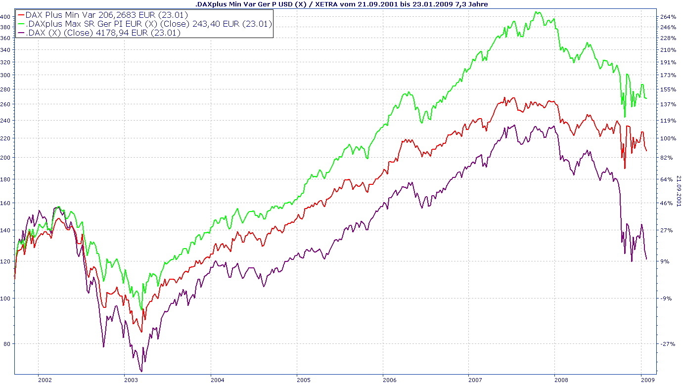 Norbert-54 Januar 24, 2009 · bearbeitet Januar 24, 2009 von Norbert-54 Die Deutsche Börse hat ca. Mitte 2007 zwei DAXplus Indizes aufgelegt, die nach Markowitz zusammengestellt sind: 1. DAXPlus Maximum Sharpe Ratio (DE000A0METL2) 2. DaxPlus Minimum Variance (DE000A0MET03) USD Information zur Berechnung und Vorgehensweise: http://deutsche-boerse.com/dbag/dispatch/e...dices_guide.pdf Anbei die Entwicklung der beiden Indizes und dem DAX selber (USD in EUR umgerechnet): 1. Bis 2001 zurückgerechnet: 2. Ab Juni 2007: In der Praxis kann´s auch mal funktionieren (Zufall?). Grüße Norbert Diesen Beitrag teilen Link zum Beitrag