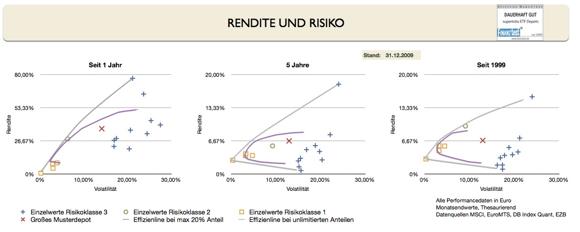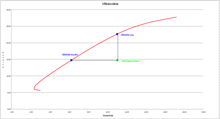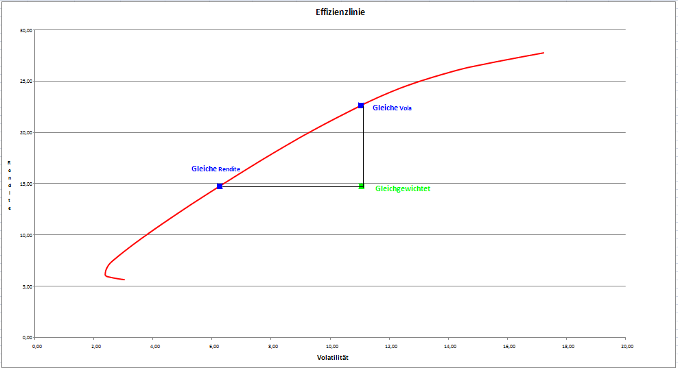 supertobs Januar 8, 2009 · bearbeitet Januar 24, 2010 von supertobs Effizienzlinie Nun geht es ans Eingemachte: Der Erstellung der Effizienzlinien. Hier im Forum hat ein Norbert-54's einen exzellenten Multi-Varianz-Optimierer zur Verfügung gestellt. Damit kann man die Schaar von Optimierungsproblemen lösen, mit der Aufgabenstellung: Minimierere die Volatitlität (Zielfunktion) durch Zusammenstellung eines Portfolios der gegebenen Indexwerte. Da die Co-Varianzen, die Vola und die Rendite immer für einen ganzen Zeitraum gelten, müssen diese Rechnungen einzeln für die drei gewählten Zeiträume durchgeführt werden. Das Tool von Norbert-54 gibt es hier: https://www.wertpapier-forum.de/index.php?showtopic=19707 Vielen Dank Norbert! (Ich hoffe der zugeschickte Wein war genehm...) Um den Einfluss von Einzelwerten auf das Gesamtportfolio zu begrenzen, wähle ich als zusätzliche Randbedingung einen maximalen Anteil von 20% pro Position (violette Effizienzlinie). Zusätzlich berechne ich die Effizienzlinie bei völlig freier Wahl der Anteile (0-100%), das ist dann die Einhüllende graue Effizienzlinie: Ich finde das große Musterportfolio schlägt sich nicht schlecht. Allerdings sollten im "Normalfall" die Effizienlinien eher so aussehene, mit deutlich besseren RK3-Werten: Diesen Beitrag teilen Link zum Beitrag