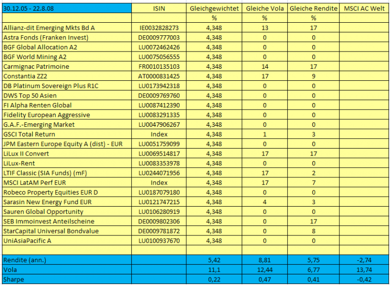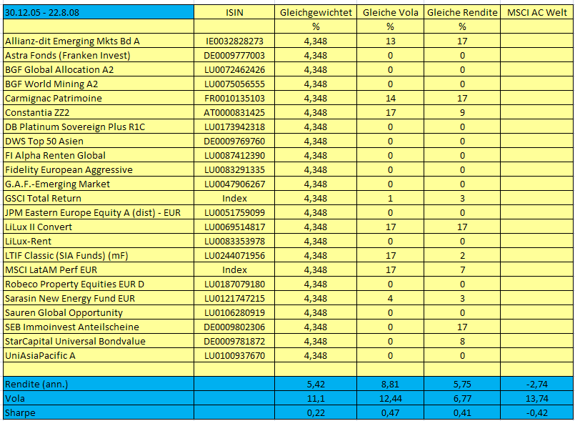 Norbert-54 Januar 25, 2009 Eine nicht unwichtige Frage ist: wie messen wir den Erfolg / Misserfolg der Anwendung der MVO in der Praxis. Ich habe mir diesbezüglich schon einige Gedanken gemacht und auch mal ein Beispiel dafür gerechnet. Mal schauen ob ich das nochmal vernünftig aufarbeiten kann, ich stelle es dann hier vor. Norbert Habe die Arbeiten inzwischen ausgegraben. Produziert habe ich die Daten im August 2008 und in einem anderen Beitrag hier im Forum bereits veröffentlicht. Hier nochmal das Wesentliche: Ich habe, basierend vom 31.12.2005 dreiundzwanzig aus damaliger Sichtweise (nicht aus Sichtweise August 2008) erfolgreiche Fonds verschiedener Anlagerichtungen ausgesucht. Die Varianz / Covarianzmatrix habe ich basierend auf den Performance Daten vom 29.12.2000 - 31.12.2005 gerechnet. Die historischen Erträge wurden aus den halblogarithmischen Charts per 31.12.2005 retrospektiv bestimmt. Die Berechnung der effizienten Portfolios wurde unter der Restriktion "maximaler Anteil pro Fonds ist 17 %" durchgeführt. Die Effizienzkurve: Daraufhin habe ich 3 Depots gebildet (Start am 31.12.2005): 1. Gleichgewichtet: das Depot mit Gleichgewichtung aller Fonds. 2. Gleiche Vola: das effiziente Depot mit gleicher Volatilität (aber höherer Rendite) wie das Depot "Gleichgewichtet". 3. Gleiche Rendite: das effiziente Depot mit gleicher Rendite (aber niedrigerer Volatilität) wie das Depot "Gleichgewichtet" Die 3 Depots habe ich bis 22.8.2008 laufen lassen, Erträge wurden reinvestiert, Rebalancing wurde nicht durchgeführt. Wenn die MVO greift, muss folgendes rauskommen: 1. Das Depot "Gleiche Vola" sollte eine ähnliche Volatilität aber eine höhere Rendite aufweisen wie das Depot "Gleichgewichtet" 2. Das Depot "Gleiche Rendite" sollte eine ähnliche Rendite aber eine niedrigere Volatilität aufweisen wie das Depot "Gleichgewichtet" Anbei die Tabelle mit den betrachteten Fonds, deren anfänglichen prozentualen Zusammensetzungen und deren tatsächlichen Renditen und Volatilitäten für den Zeitraum 31.12.2005 - 22.8.2008 (in den blauen Feldern): Ergebnisse: 1. Das Depot "Gleiche Vola" hat eine ähnliche Volatilität aber eine höhere Rendite wie das Depot "Gleichgewichtet" 2. Das Depot "Gleiche Rendite" hat eine ähnliche Rendite aber eine niedrigere Volatilität wie das Depot "Gleichgewichtet" Dieser Ansatz hat demnach geklappt (Zufall?). Ob die ursprünglichen historischen Renditen, die Rechengrundlage waren, erreicht wurden (sie wurden es nicht), war in diesem Experiment offensichtlich unerheblich. Norbert Diesen Beitrag teilen Link zum Beitrag