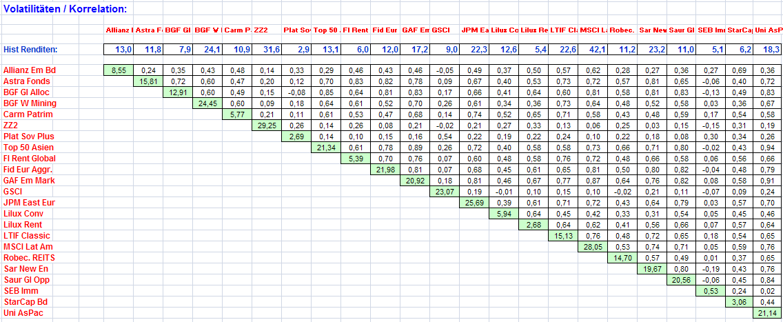 Norbert-54 Januar 26, 2009 Könnte darin ein Schwachpunkt Deines für mich sehr beeindruckenden Experiments liegen? Könnte also durch Dein Auswahlkriterium "erfolgreich" eine Bandbreitenverengung passiert sein, die das Ergebnis beeinflusst hat? MVOs springen wohl auf verhältnismäßig starke Renditen überproportional an und reagieren dann auch extrem auf kleinste Veränderungen. Gibt man ihnen relativ homogene Daten, dann könnten dadurch die Extremreaktionen vielleicht minimiert werden. An der generellen Funktion(sweise) der MVOs möchte ich gar nicht zweifeln, nur die Zuverlässigkeit müsste man maximieren können, sodass zumindest die Tendenz der Ergebnisse sicher wäre. Ein paar Prozentpunkte in der Aufteilung hin oder her wären ja zu verschmerzen. Aber das große Ganze sollte wenigstens stimmen. saludos, el galleta Hallo el galleta, Wenn man sich das Effizienzkurven Chart anschaut, sieht man , dass die Renditen der Depots vor Dezember 2005 hinterher nicht erreicht wurden, deren Volatilitäten jedoch sehr wohl gleich geblieben sind. Volatilitäten und Korrelationen können sich zwar innerhalb kürzerer Zeiträume durchaus stark verändern, längerfristig muss dies aber nicht unbedingt der Fall sein. Vermutlich haben sich letztere in der Phase zwischen Ende 2005 bis August 2008 nicht wesentlich im Vergleich zu den 5 Jahren vorher verändert oder Änderungen haben sich gegenseitig kompensiert. Vermutung: die Effizienz der MVO bleibt auch bei Änderung der Ertragssituation dennoch mehr oder weniger intakt wenn die Volatilitäten und Korrelationen konstant bleiben. Anbei die Tabelle mit den Volatilitäten, Korrelationen und Renditen, die in Berechnung eingeflossen sind. Diese Daten sind nicht wirklich homogen. Grüße Norbert Diesen Beitrag teilen Link zum Beitrag