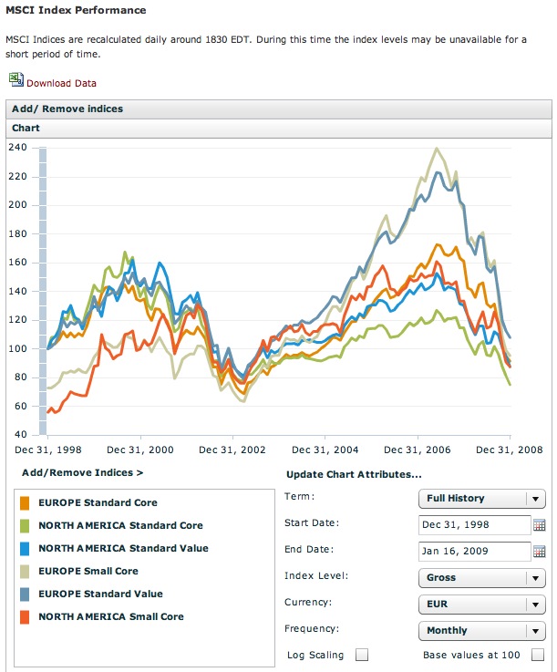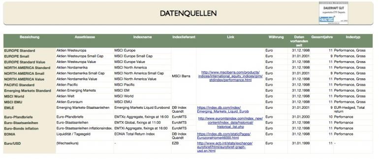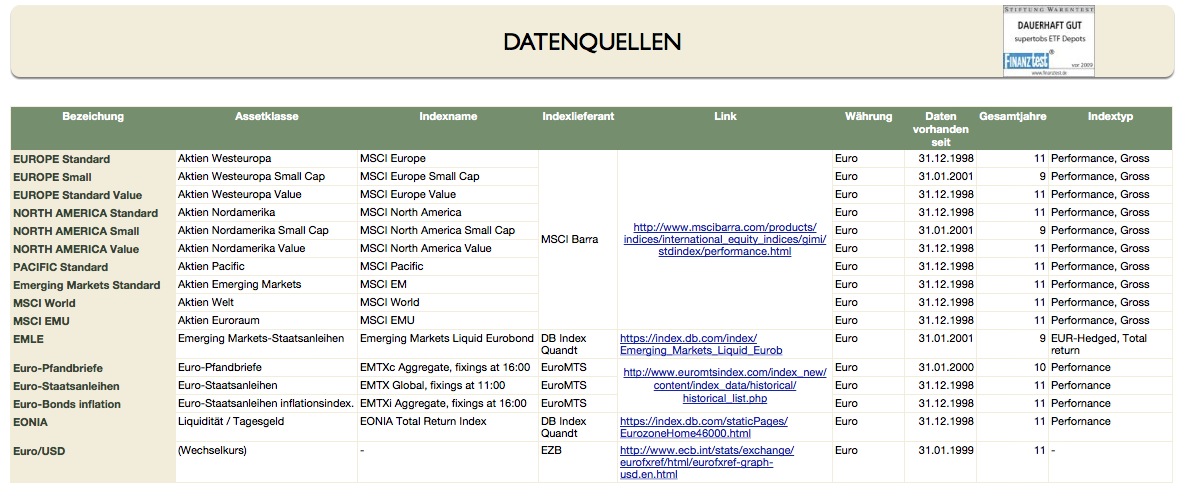 supertobs Januar 7, 2009 · bearbeitet Januar 23, 2010 von supertobs Die Datenlage Der aufwendigste Teil der Arbeit ist es geeignete (kostenlose) historische Kurse über lange Zeiträume zu finden. Zusätzlich hat man das Problem, das ab 1999 in Europa der Euro offiziell eingeführt wurde. Will man über diesen Zeitraum hinaus Daten haben, muss man wohl oder übel in US-Dollar rechnen. Man kann auch diese Werte dann nur schlecht wieder in Euro umrechnen. Weiterhin muss darauf geachtet werden, die Performance-Werte der Indices zu bekommen. Diese beinhalten die (fiktive) Neuanlage von Ausschüttungen im selben Index. Ungeeignet sind Preisindizes, die nur die Kursstände ohne Ausschüttungen wiedergeben. Bei Performance-Werten stellt sich das Problem der steuerlichen Behandlung von Ausschüttungen. So gibt es länderspezifische Quellensteuern (z.B. nimmt Finnland Quellensteuern auf Dividenden von Nokia) und natürlich ist für jeden Anleger selbst gegebenenfalls eine Versteuerung durchzuführen. Man ein Index kann man auch (fiktiv) versteuert bekommen. Andere aber nicht, dann wird ein Vergleich schwierig. Wirklich exakt und realistisch kann wohl nicht rechnen. Ich habe mich deshalb auf den reinen Bruttowert festgelegt. Als Zeitpunkt des Indexwertes habe ich Monatsendwerte gewählt. Die meisten Werte sind am Monatsschluss zu bekommen. Notfalls (eher die Ausnahme) kann man einzelne Wert am Monatsanfang nehmen. Man kann auch Werte für jeden einzelnen Tag bekommen. Hier hat man aber Prüfaufwand, da nicht jeder Tag weltweit ein Börsentag war. Somit gibt es manchmal Lücken. Besser sind wirklich Monatsendwerte. Alles wird eingetragen in eine große Tabelle mit Spalten der Indices und Zeilen der Monatsendwerte. Datenquelle - RK3 RK3 ist am einfachsten zu bekommen. Auf der Webseite von MSCI kann man alle Indices bekommen, diese bequem noch nach "Standard core", "Value" und "small" und weitere unterteilen. Hier bekommt man die Daten: http://www.mscibarra.com/products/indices/international_equity_indices/gimi/stdindex/performance.html Man klickt auf einen Index (fast egal welchen) und kann dann in einer Maske Indexwerte separat hinzufügen. Bis zu 6 Indices sind gemeinsam wählbar. Ich möchte die tatsächlichen Indexwerte haben, also lasse ich sie nicht bei 100% starten. Hier ist ein Screenshot mit allen Einstellungen. Ist man fertig mit den Einstellungen, klickt man auf "Download Data". Datenquelle - RK2 Hier wird es richtig schwierig. Es ist mir (anfangs) nicht gelungen frei verfügbare Daten für USD-Staatsanleihen und Euro-Corporate Bonds zu bekommen. Mit kostenpflichtigen Daten (iboxx) konnte ich einiges berechnen, aber nicht nachhaltig und nicht hier zu veröffentlichen. Man kann bei einigen ETF-Anbietern einige Daten bekommen, aber nur so Lange wie der ETF auch existiert. Das ist meist erst seit 2001 oder 2002 der Fall, wenn nicht sogar später. Mittlerweile ist DB Index Quant deutlich großzügiger mit den Daten: https://index.db.com/dbiqweb2/home.do?redirect=investible Ich beschränke mich aber auf den EMLE-Index. Diesen kann man hier holen, download der Daten unter "Time Series Report", mit "Return Type: Hedged": https://index.db.com/dbiqweb2/index/Emerging_Markets_Liquid_Eurob Der EMLE ist ein typisches Beispiel für eklige Nacharbeit: Die Daten gibt es mit "." statt "," und die Daten gibt es nur tageweise und nicht nach Monatsende. Man muss dann noch ein wenig nacharbeiten. Datenquelle - RK1 Hier beziehe ich mich im Wesentlichen auf die Webseite von EuroMTS. Hier wird man bei den historischen Kursen für den Euroraum schön fündig. Die Kurse haben unterschiedliche Fixing-Zeiten (11:00; 16:00). Man muss schauen, welche Kurse eine längere Historie haben. Bei DB Index Quant bekommt man auch den EONIA als "Total Return Index". Bei der EZB kann man sich die EUR/USD Kurse anschauen. Um immer genau nachvollziehen zu können welchen Datenquellen ich genommen haben, habe ich ein Zusatzblatt in den Numbersfile aufgenommen: Diesen Beitrag teilen Link zum Beitrag