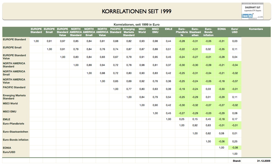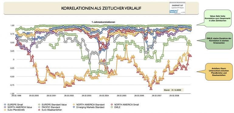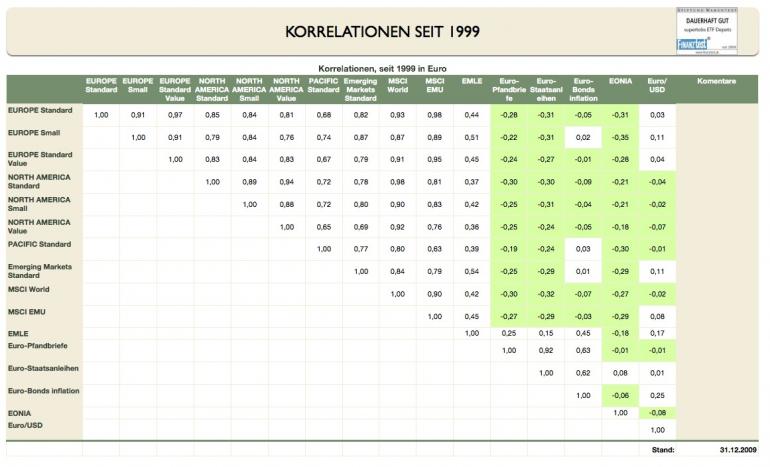 supertobs Januar 7, 2009 · bearbeitet Januar 23, 2010 von supertobs Korrelationen Aus den oben gesammelten Daten nun die Korrelationen zu berechnen ist eigentlich ganz einfach. Alle Werte liegen in Euro vor oder könnten leicht durch die Eur/USD-Wechselkurse umgerechnet werden. Als erstes muss man die prozentualen monatlichen Änderungen berechnen: (GL 1) Monatsperformance_Monat2 = (Kurswert_Monat2 - Kurswert_Monat1) / Kurswert_Monat1 Die durch Gleichung (1) entsteht eine gleich große Tabelle wie die eigentliche Kurswerttabelle abzüglich einer Zeile. Nun wird die Korrelationsfunktion der Tabellenkalkulationsprogramms genutzt. Die Korrelation des Index1 mit dem Index2 wird einfach bestimmt durch (GL 2) KORREL(GanzeSpalte_Index1; GanzeSpalte_Index2) Das muss für jeden Index mit jedem anderen Index so berechnet werden. Man kann das direkt in einer Korrelationstabelle zusammenfassen. Diese Korrelationsdaten beziehen sich nun auf den gesamten Zeitraum. Untermengen von z.B. der letzten 5 Jahre und des letzten Jahres muss man getrennt berechnen. Man bildet Submengen und erstellt am Besten eigene Korrelationstabellen, um Fehler zu vermeiden. Hier die Daten über den gesamten Zeitraum: Analyse Die Aktienwerte sind erwartungsgemäß alle positiv korreliert. "Small" zu seinem Standardmarkt ist mit 0,89 (MSCI NA) bzw. 0,91 (MSCI Europe) korreliert. "Value" ist zu seinem Standardmarkt sehr hoch korreliert, fast 1. Die niedrigsten Korrelationen finden sich alle beim MSCI Pacific, zwischen 0,65 und 0,74. Es lohnt sich also schon diesen Teil abzubilden. Die "Durchschnittskorrelation" aller Aktienkorrelationen beträgt 0,83. Werte aus Risikoklasse 1 sind zu Aktien erwartungsgemäß negativ korreliert. Die niedrigste Korrelation liegt allerdings nur bei ca. -0,35. Die Durchschnittskorrelation liegt bei -0,11. Besonderheit Emerging Market Anleihen Anleihen EM haben eine zu allen Aktienmärkten positive Korrelation. Insbesondere zu Aktien EM (0,43). Warum sind EM-Staatsanleihen in Euro als Typ "Anleihe" überhaupt positiv korreliert? Ich darf hier Torman zitieren: Die Unterscheidung in Emerging Markets und Industrieländern ist nicht zufällig. Viele Anleger sehen nach dem Boom der letzten Jahre in EMs vor allem das große Aufholpotenzial. Das ist auch durchaus vorhanden. Allerdings sollte man auch über die Frage nachdenken, warum diese Länder überhaupt soweit zurückliegen. Das zentrale Unterscheidungsmerkmal zwischen EM und den klassischen Industrieländern ist nicht der Wohlstandsunterschied, sondern die Ursache für den Wohlstandsunterschied. Das kapitalistische Wirtschaftssystem braucht zur optimalen Entwicklung eine Reihe von Voraussetzungen wie z.B. Rechtssicherheit, Vertragsfreiheit, eine unabhängige Zentralbank uvm. Genau an diesen Punkten mangelt es den meisten EMs. Wenn ein Land permanent daran arbeitet, diese Grundlagen zu verbessern so wird es den Anschluss an die Industrieländer in einigen Jahrzehnten schaffen. Das ist die positive Story. Häufig ist es leider anders. Dann wird jede Krise (und Rezessionen sind nun einmal immanenter Bestandteil der Wirtschaftsentwicklung) zu einer ernsthaften Gefahr, bei der die Fortschritte wieder komplett verloren gehen können. Die Krise wird dann so stark, dass sie die gesamte wirtschaftliche Basis der Gesellschaft und damit des Staates bedroht. Somit erklärt sich die positive Korrelation. Ein wirtschaftlicher Abschwung betrifft dann eben nicht nur die einzelnen Unternehmen (und damit ihre Aktien), sondern den Staat selbst (und damit seine Kreditwürdigkeit). Im Falle der Erfolgsstory ist die Korrelation zwischen den Aktien der Unternehmen und den Anleihen des Staates ebenfalls positiv, da beide von dem enormen Aufholprozess profitieren. Seit v0.91 bestimme ich auch die zeitlichen Verläufe der 1-Jahreskorrelationen aller Indices zum MSCI Europe bestimmt. Hierbei wurden zu jedem Monatsanfang die folgende Ein-Jahreskorrelation bestimmt. So sieht das Bild aus: Interessant ist die starke Zunahme der Korrelation der Anleihen und insbesondere der Pfandbriefe in der Finanzkrise. Diesen Beitrag teilen Link zum Beitrag