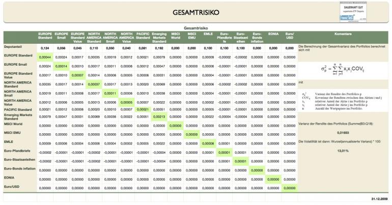 supertobs Januar 8, 2009 · bearbeitet Januar 24, 2010 von supertobs Rendite und Volatilität des Gesamtportfolios Die Rendite eines Gesamtportfolios setzt sich einfach aus den Anteilen der Einzelwerte zusammen. Die Gesamtrendite ist in obiger Tabelle enthalten. Bei der Bestimmung der Volatilität des Gesamtportfolios muss man etwas mehr Arbeit reinstecken. Im Gegensatz zu den einfach zu bestimmenden Einzelvolatilitäten muss man zunächst die Kovarianzen berechnen. Diese können wieder über die Monatsperformancedaten bestimmt werden: (Gl 5) Kovarianz(Index1 zu Index 2) =KOVAR(Historische_Monatsperformance :: GanzeSpalte1; Historische_Monatsperformance :: GanzeSpalte2)*12 Aus (Gl 5) kann man die "Varianz" des Portfolios berechnen: mit Es ergibt sich dann einfach für die Volatilität des Gesamtportfolios (Gl 6) VolaGesamt = Wurzel(annualisierte Varianz) * 100 Diese Werte sind in der obigen Renditentabelle enthalten. Es zeigt sich der risikomindernde Effekt der Diversifikation: Im Gegensatz zur reinen Mittelung der Einzelvolatilitäten erreicht man ein um -2% bis -2,5% verminderte Volatilität. Ich bezeichne das mal als "Diversifikationseffekt". Für diese Rechnungen macht man am Besten eine eigene Kovarianztabelle auf (nicht gezeigt hier) und eine eigene Tabelle um die Varianz auszurechnen: Diesen Beitrag teilen Link zum Beitrag