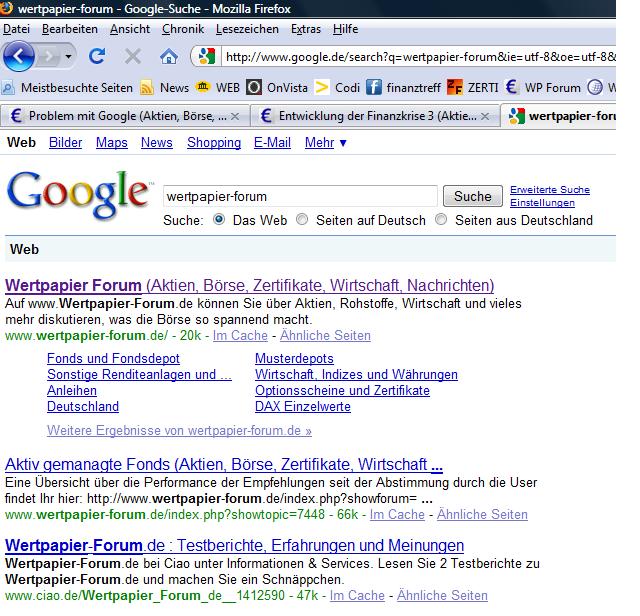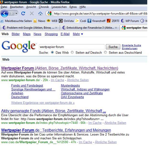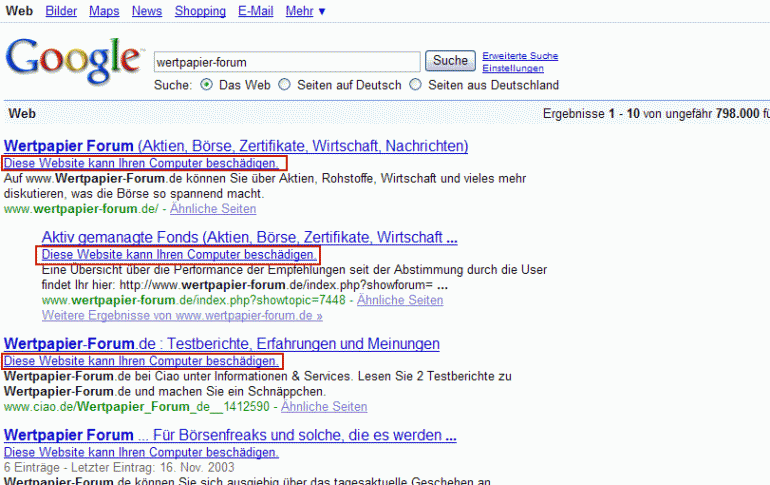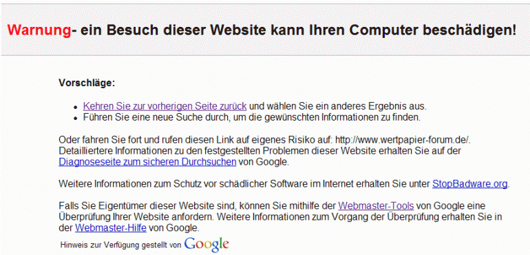 Toni Januar 31, 2009 · bearbeitet Januar 31, 2009 von Toni Seit heute erhalte ich wenn ich nach irgendwas suche mit Google.de (MS-Internet-Explorer) unter jedem gefundenen Link einen Hinweis, dass der Aufruf der Website meinen Computer beschädigen könnte. Als Beispiel mal die Suche in Google.de nach dem Wort wertpapier-forum. Ich bekomme folgende Ergebnisse angezeigt (was mir neu ist, in rot): Ok, Google macht auf Sicherheit, will mich warnen. Aber das dumme ist, dass diese Warnung scheinbar für JEDE Website gilt und ich auch kein einzigen Link aufrufen kann! Wenn ich auf einen der gefundenen Links klicke, bekomme ich: Aber auch wenn ich den Link auf eigenes Risiko aufrufen wollte, müsste ich ihn mit copy und paste rausholen, ich kann nicht einfach draufklicken... FAZIT: Google ist für mich seit heute nicht mehr verwendbar! WAS SOLL DAS???? Diesen Beitrag teilen Link zum Beitrag