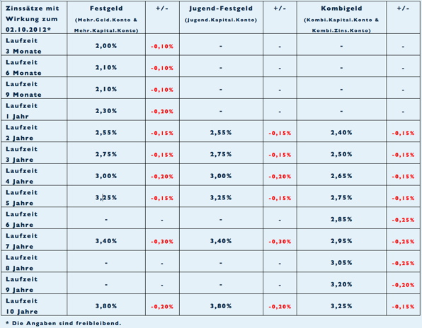 neysee Januar 9, 2013 Es geht weiter abwärts, ab morgen 1,8% aufs Tagesgeld. Ebenso Abschläge beim Festgeld bei Laufzeiten bis 1 Jahr, der Rest bleibt gleich (wobei die Festgeldzinsen schon vor einem knappen Monat durchweg gesenkt wurden). Wie üblich gibt es eine Frist für Bestandskunden, in der Festgeld noch zu den alten Konditionen abgeschlossen werden kann. Diesen Beitrag teilen Link zum Beitrag