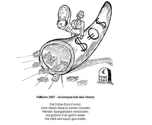 Erstmals bei einer Notenbank-Konferenz 1999, später auch in Dubai bei der Arabischen Liga sprach Greenspan "von einer grundsätzlichen Dollarkorrektur bis 2007" und weiter von einer "Vereinigung Dollar Euro zum Euro-Dollar", einer neuen Welt-Währung. Vielleicht bekommt man dann für 100 alte Euro nur noch 10 neue Euro-Dollar. Das ist eine arglistige Methode, um die Währungsschulden der Staaten abzuwerten und damit den Bürgern ihr Altgeld "zu entsorgen". Hauptgewinner in diesem ungleichen Monopoly wäre der US-Staat; dieser könnte mit einem Schlag seine Auslandsschulden von etwa 8 Billionen Dollar drastisch reduzieren, mit dem obigen Abwertungsbeispiel von 8 auf 0,8 Bio. oder auf 800 Milliarden. Nicht nur der Weltbürger, sondern alle Zentralbanken mit Dollarreserven würden zu den Gelackmeierten zählen.
