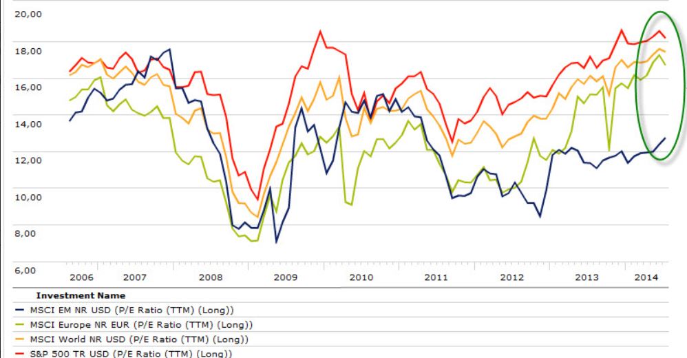 Das durchschnittliche Kurs-Gewinn-Verhältnis von amerikanischen, europäischen und globalen Aktien ist zuletzt nur minimal zurückgegangen; bei Schwellenländern, die im Sommer sogar kräftig zugelegt haben, zeigt die Bewertung anhand des Durchschnitts-KGV des MSCI Emerging Markets sogar nach oben.