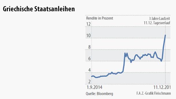Die Unruhe an den griechischen Finanzmärkten nimmt angesichts der Präsidentenwahl in der kommenden Woche weiter zu. Auch am Donnerstag sorgte Verkaufsdruck bei Aktien und Anleihen für sinkende Kurse. Am Markt für Staatsanleihen lag die Rendite dreijähriger Papiere am Nachmittag bei 10,12 Prozent. Am Aktienmarkt brach der ASE-Aktienindex um rund 8 Prozent ein. Damit erreichte er seinen niedrigsten Stand seit Juli 2013. Im Gegenzug stieg die Nachfrage für sichere Staatsanleihen. Die Rendite zehnjähriger Bundesanleihen erreichte mit 0,65 Prozent ebenso einen historischen Tiefststand wie die Rendite zehnjähriger Staatsanleihen aus der Schweiz mit 0,23 Prozent.