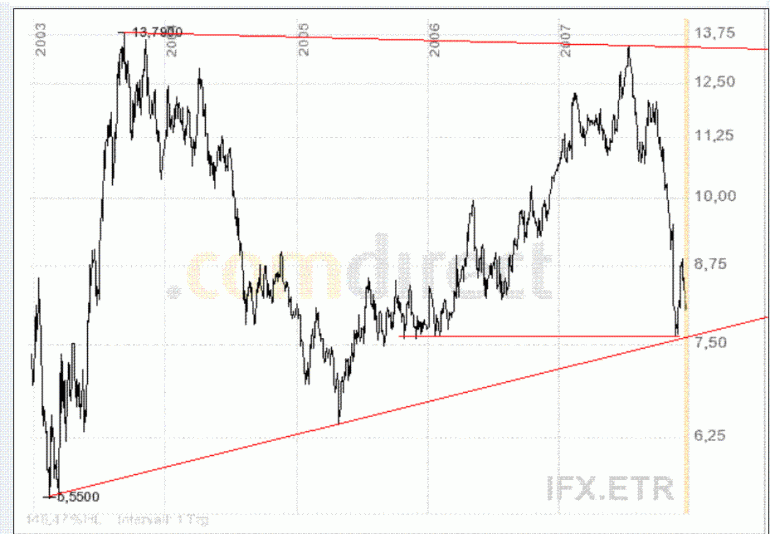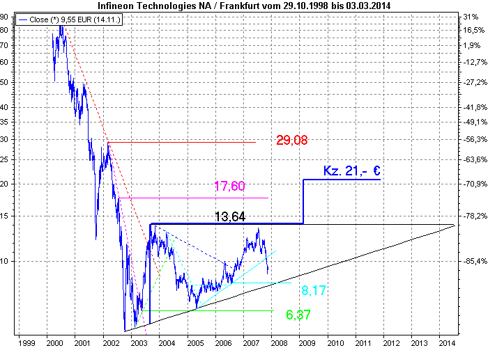 Aktiencrash November 16, 2007 Ich habe mir mal wieder die Infineon Aktie reingezogen. Viel hat sich nicht seit der letzten Analyse verändert. Der Aufwärtstrend ist witerhin intakt, mit dem Unterschied, das die horiz. Unterstützung nun bei 8,17 für den laufenden Trend liegt. Ich will jetzt hier nicht viel erzählen, aber eines ist Gewiss. Die Aktie ist noch zu breit gestreut. Daher versucht man sie im Langeweile-Modus einzusammeln. Einfach ausgedrückt, es bildet sich ein Dreieck (rot angedeutet). Das Potenzial liegt bei 8 . Würde der Ausbruch um die 11 stattfinden, wäre der sekundäre horiz. Widerstand um die 17,60 genommen. Das Kursziel läge damit bei mindestens 19 . Im Anschluß eine Konsolidierung, mit Angriff auf den Widerstand 29,08 . Fazit: Die Aktie ist bis auf den jetzigen Aufwärtstrend langweilig. Würde ein Rückfall zur Unterseite des Dreiecks abwarten um den langfristigen Aufwärtstrend bis 29,- mitzureiten . Vor knapp einem Jahr habe ich diese letzte Analyse gemacht und langsam nimmt sie Form an B) ! Die nächste Unterstützungsbereich bei 8,17 wartet auf Infineon. Jetzt bleibt abzuwarten ob die Aktie hier halt findet. Von einem symetrischen Dreieck wie vor einem Jahr kann man nicht mehr sprechen. Vielmehr muß man von einem ansteigen Dreick ausgehen, wenn es die Aktie es schafft im Unterstützungsbereich (8,17 ) nach oben zu wenden. Bei jetziger Konstelation würde das Kursziel bei Ausbruch nach oben von 19 auf 21 ansteigen. Der Ausbruch aus dem Dreieck nach oben sollte meiner Meinung begleitet werden von positiven fundamentalen Zahlen. Da dies zur Zeit nicht gegeben ist, ist der Kursverlauf seit 2002 nur von reiner Spekulation getrieben. Fazit: Eine Investition sollte man nur wagen, wenn die fundamentalen Zahlen in den kommenden Quartalen positiv ausfallen. Die horiz. Widerstandszone von 13,64 sollte man sich daher bei Infineon merken, denn ich wette das diese schnell nach oben bricht, wenn die Zahlen positiv ausfallen werden. Bei negativen Zahlen in der Zunkunft, wird nicht mal der Unterstützungsbereich von 8,17 die Aktie aufhalten. Bis dahin heißt es abwarten und Tee trinken . Diesen Beitrag teilen Link zum Beitrag