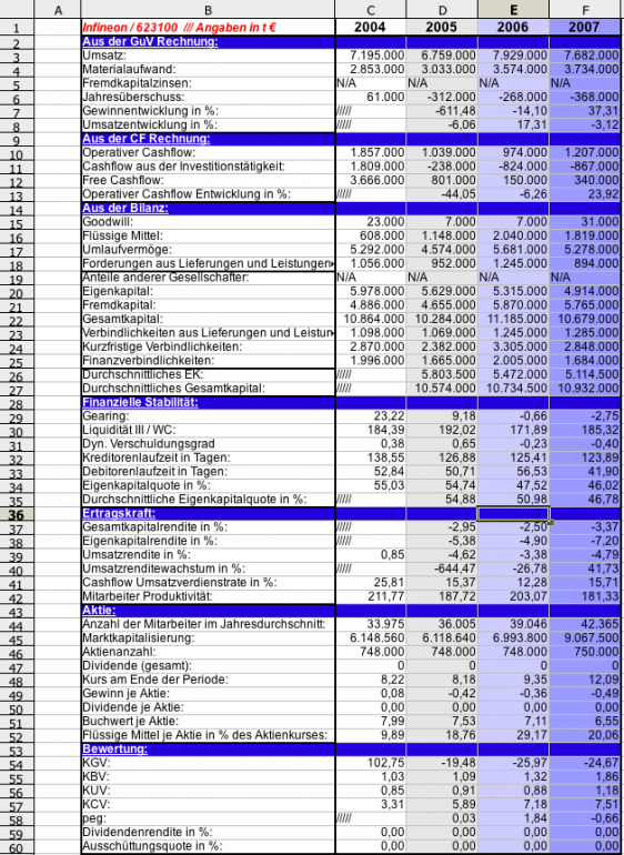 Drella Dezember 17, 2007 · bearbeitet Dezember 17, 2007 von Profi zwecks mehr gefühl für neue kennzahlen erstelle cih zur zeit ein paar meiner gewohnten übersichten zu unternehmen. hier nur schnell meine übersicht zu infineon von 2004-2007 ohne kommentar: Diesen Beitrag teilen Link zum Beitrag