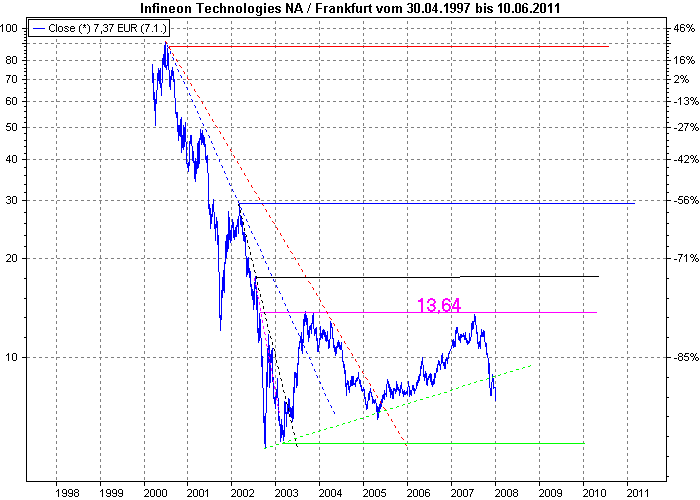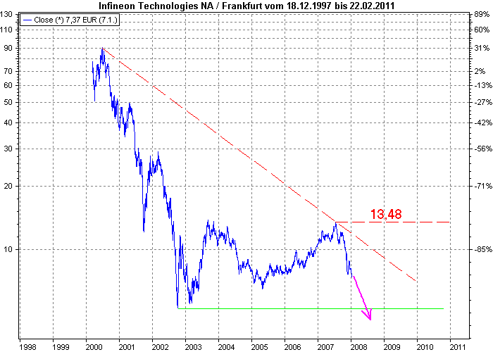 Aktiencrash Januar 8, 2008 Fazit: Eine Investition sollte man nur wagen, wenn die fundamentalen Zahlen in den kommenden Quartalen positiv ausfallen. Die horiz. Widerstandszone von 13,64 sollte man sich daher bei Infineon merken, denn ich wette das diese schnell nach oben bricht, wenn die Zahlen positiv ausfallen werden. Bei negativen Zahlen in der Zunkunft, wird nicht mal der Unterstützungsbereich von 8,17 die Aktie aufhalten. Bis dahin heißt es abwarten und Tee trinken . Ich weiß nicht warum jemand überhaupt schon bei Infineon investiert ! Ein Grund wäre höchstens, man ist ein Aktiv-Trader . An der charttechnischen Aussicht hat sich nichts geändert. Der nächste horiz. Widerstand liegt immer noch bei 13,64 . Eine Bodenbildung ist noch nicht in Sicht. Das absolut störende an dem Chart sind überhaupt die große Anzahl von Abwärtstrends+horiz. Widerständen. Der primäre horiz. Widerstand (rot) liegt bei ca. 87 , was viel zu hoch ist. Würde sich ein neues Tief ergeben, dann fällt dieser primäre Widerstand auf mindestens 13,48 , damit wäre nach oben alles offen. Fazit: Die Bodenbildung wäre abgeschlossen, wenn der nächste horiz. Widerstand bei 13,64 durchbrochen wird. Die Chance ist aber auch sehr groß das ein neues Tief generiert wird, wobei der primäre Widerstand auf min. 13,48 fallen würde. Da beide Punkte nicht erfüllt sind, heißt es weiterhin Tee trinken und die Bodenbildung abwarten. Diesen Beitrag teilen Link zum Beitrag