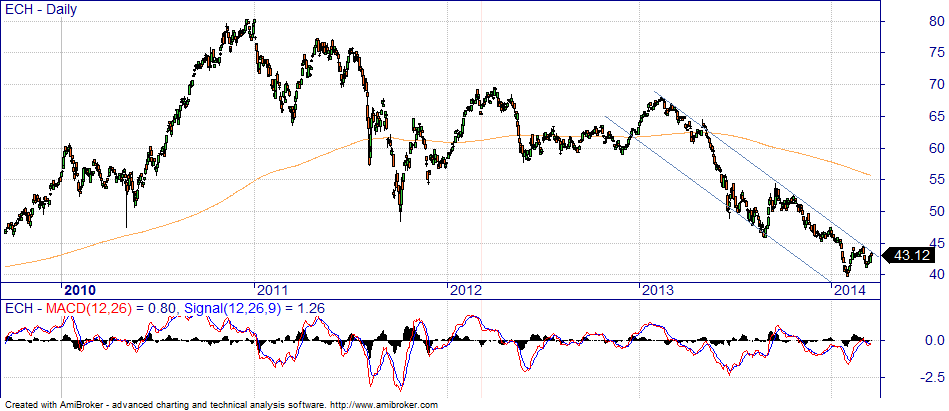 el galleta Mai 30, 2009 Der hier dargestellte MSCI-Chile-ETF wurde erst 2007 aufgelegt.Der chilenische Markt selbst hat jedoch eine ähnliche Performance aufzuweisen, wie der mexikanische oder der brasilianische. Darauf bezieht sich die Aussage des übergeordneten Aufwärtstrends. Hm, na ich weiß nicht. saludos, el galleta Diesen Beitrag teilen Link zum Beitrag
