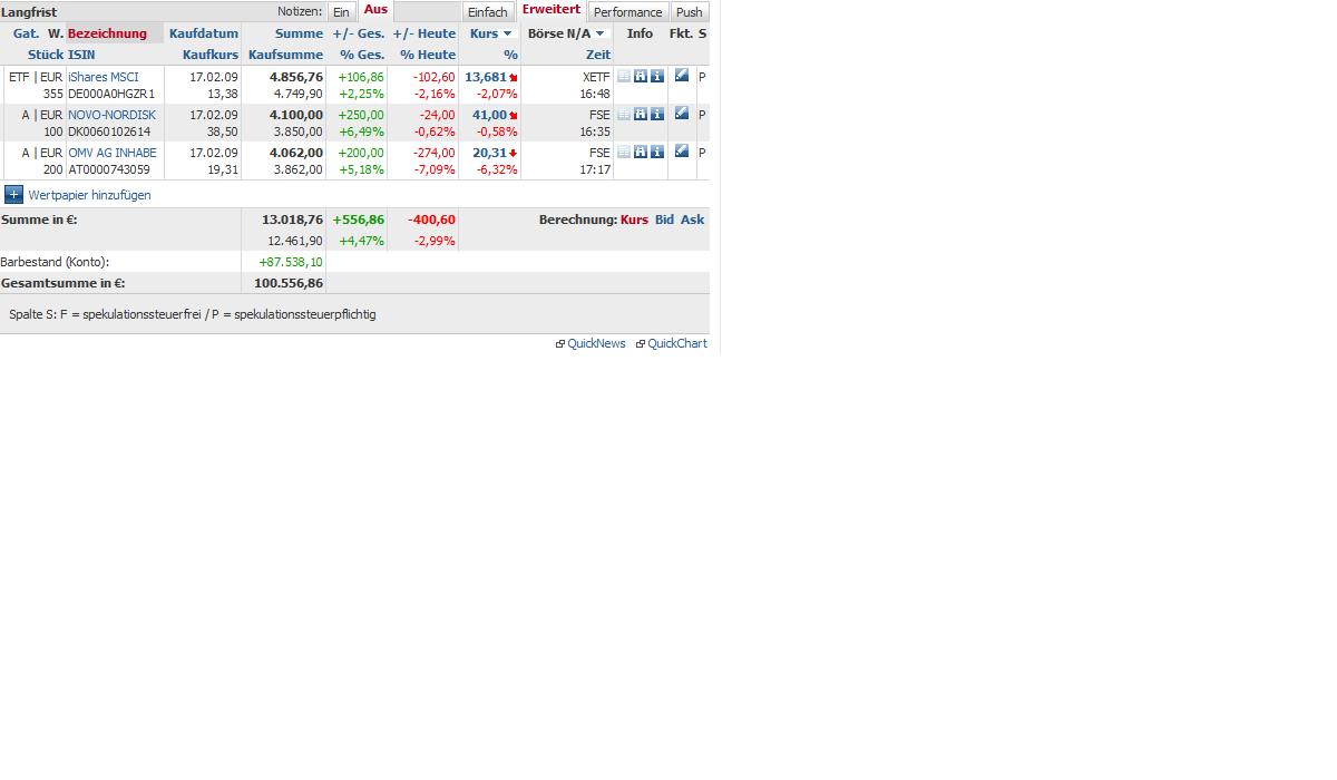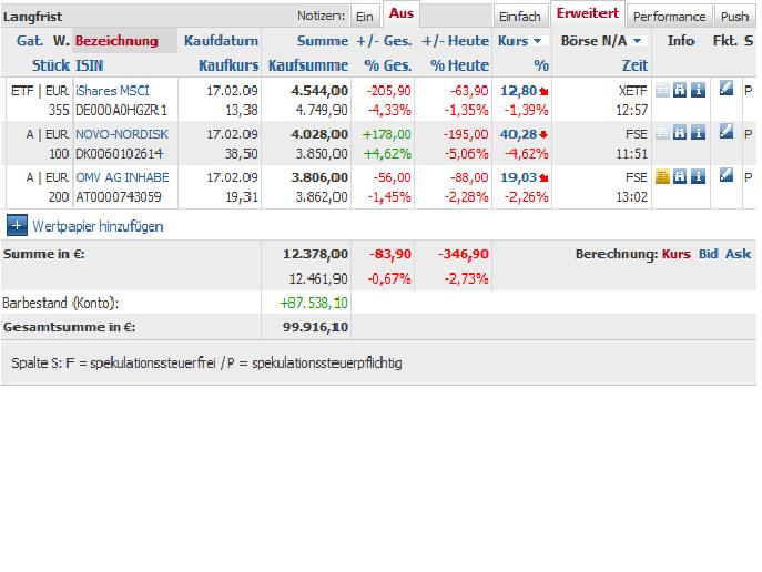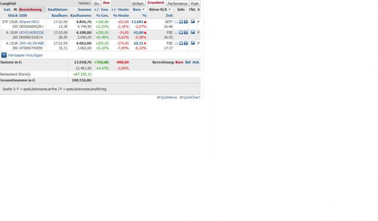 Ich habe in der Realität 3 Depots. Ein trading Depot. Hier werden Position normalerweise zwischen 1 Woche und 3 Monaten gehalten. Einstiege normalerweise nur nach Charttechnik. Manchmal Zocke ich auch ein wenig so wie aktuell mit einer kleinen Position auf Infineon.
