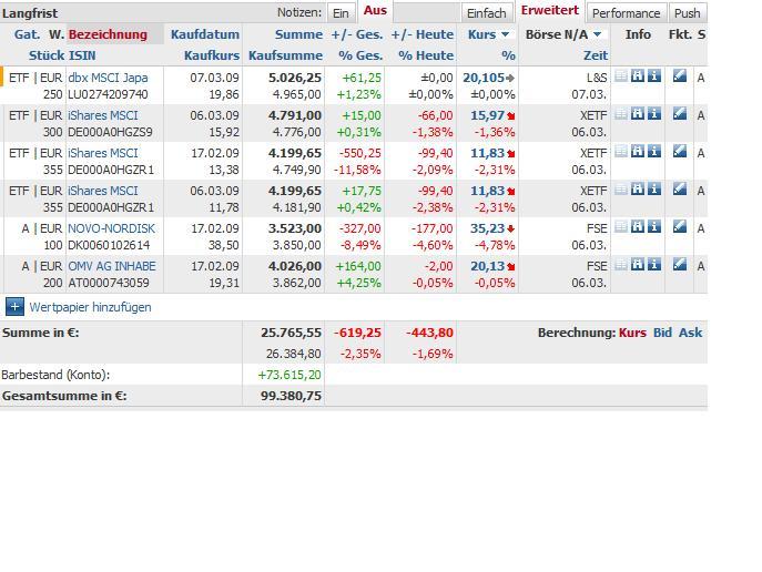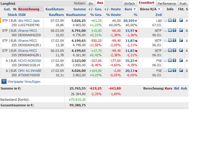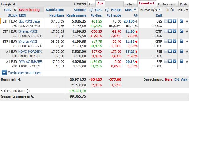 ETF´s haben denn Vorteil das sie sehr Kostengünstig sind und man mit ihnen einfach breite Märkte abdecken kann. Ausserdem habe ich damit kein Einzelaktienrisiko. Ich möchte die Positionen ja mindestens 25-30 Jahre halten ohne zischendurch zu verkaufen wegen dem Steuervorteil. Wenn die Börsen im laufe der Jahre in eine übertreibungsphase nach oben übergegangen sind habe ich vor das Depot mit denn Ausgeschüttenden Erträgen mit laglaufenden Put Optionscheinen abzusichern die weit aus dem Geld liegen. Die Vola ist in solchen Zeiten sehr niedrig so kann man sie billig kaufen.